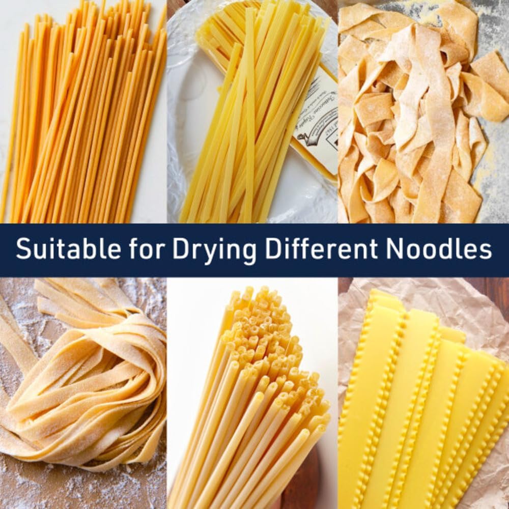 QUALITY CONSTRUCTION – Crafted from sturdy wood, the pasta rack can hold a lot of pasta at one time without tipping over. The high-quality construction ensures this pasta hanger rack will be one of your favorite pasta making tools for years to come.