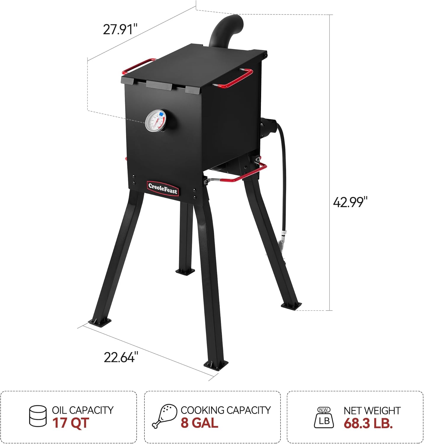 54,000 BTU Propane Burner: A single powerful jet burner ensures rapid oil heating, delivering crispy chicken, chips or fish in minutes. Perfect for large gatherings, tailgates or camping adventures