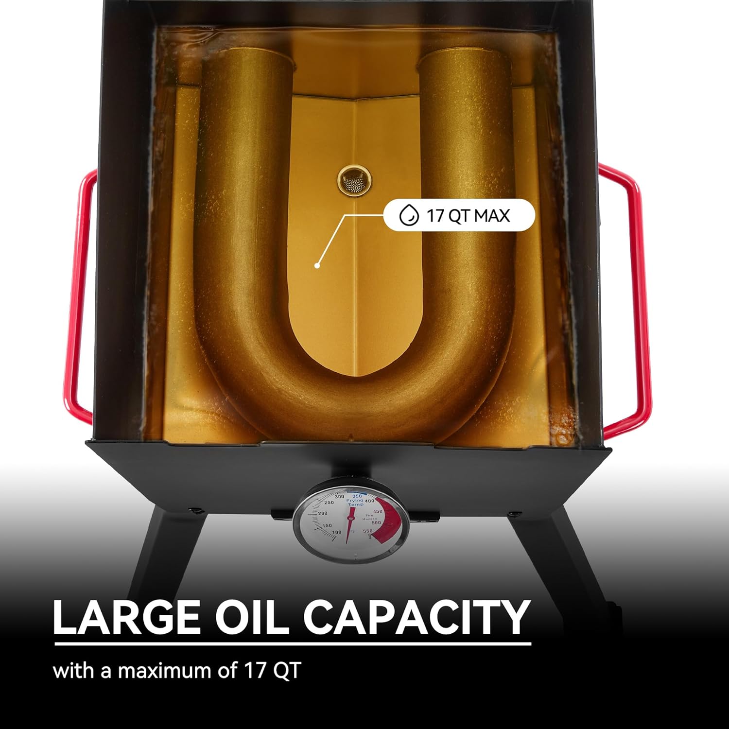 Large-Capacity Outdoor Deep Fryer with Baskets: Maximize efficiency with 17 quarts of oil capacity and two 4-gallon stainless steel baskets—cook crispy chicken, golden fries, fresh fish, or donuts effortlessly. Perfect for BBQs, food trucks, and outdoor events