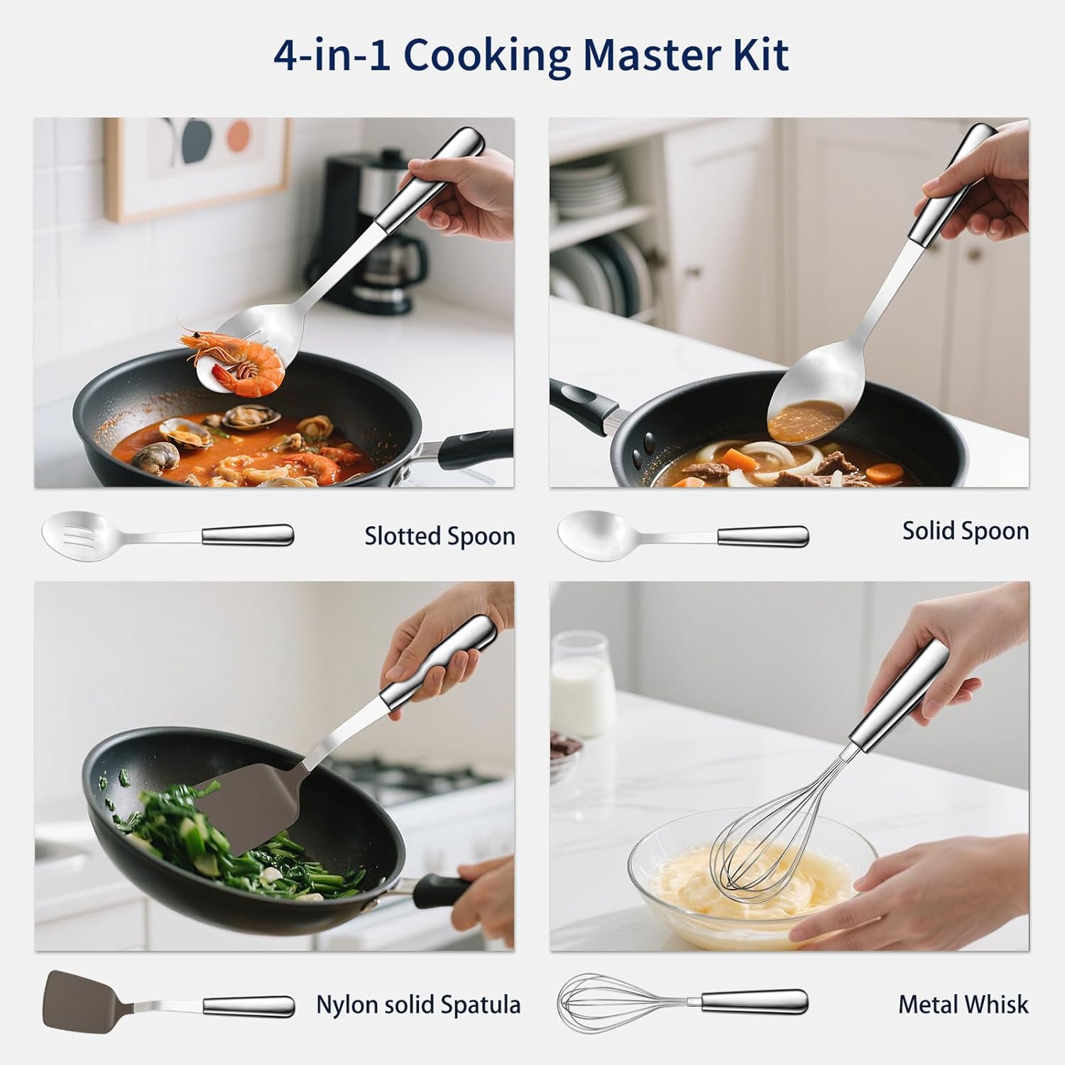 【Essential Cooking Basics】Equip your kitchen with essential cooking basics using our 4-piece kitchen utensil set, perfect for both novices and seasoned cooks. This set includes a Solid Spoon, Slotted Spoon, Solid Flexible Spatula, and Whisk, covering your daily cooking needs effortlessly.