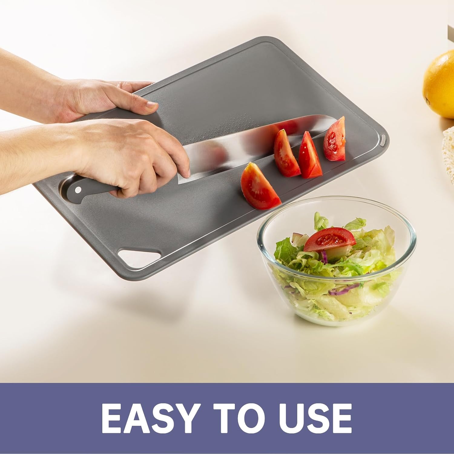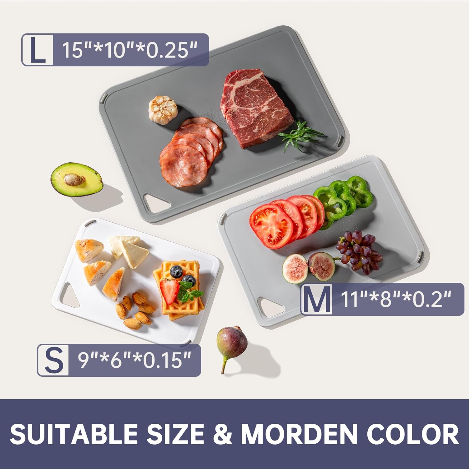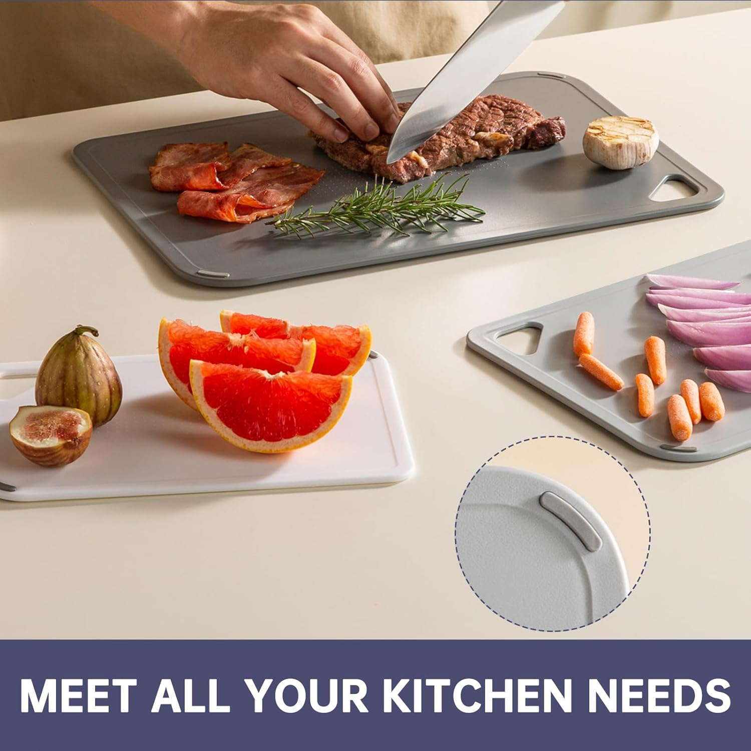 DOUBLE-SIDED REVERSIBLE, DOUBLE ANTI-SLIP: Our kitchen set is equipped with premium rubber anti-slip feet on both sides to fix the cutting board on the kitchen countertop. No matter which side you use, the BPA-free cutting boards is stable enough. Exceptly, one side is designed with a unique anti-slip particle area. Whether it is cutting raw meat or fish, there is no pressure, making cutting easier and safer!