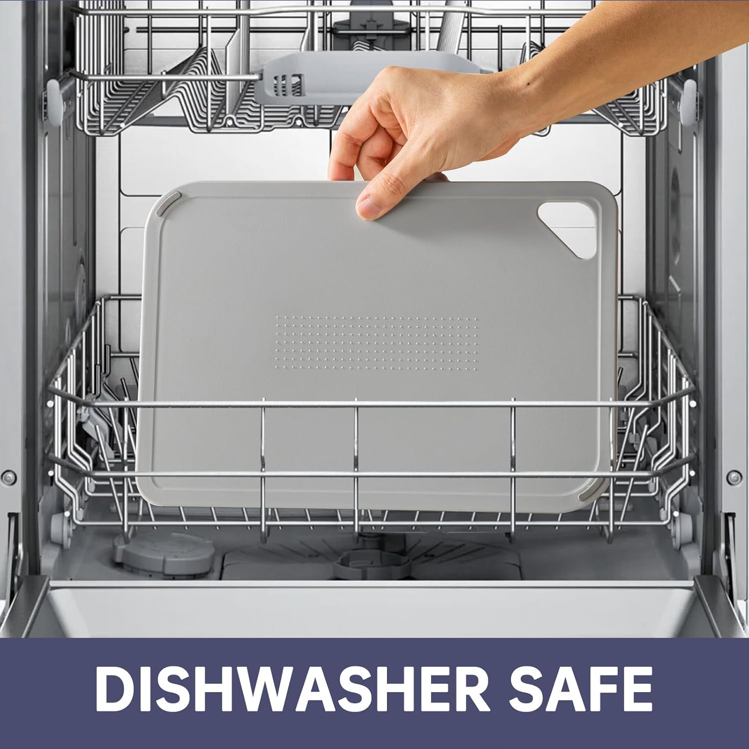 EASY TO CLEAN AND CONVENIENT USE: Our kitchen chopping boards are BPA-free, so they can be directly put into the dishwasher after use. Or wash them by hand with soap as your needed to easily remove stains. Each gray cutting board is equipped with a triangular handle for easy access and storage, and can also be hung in your camper or truck for use.