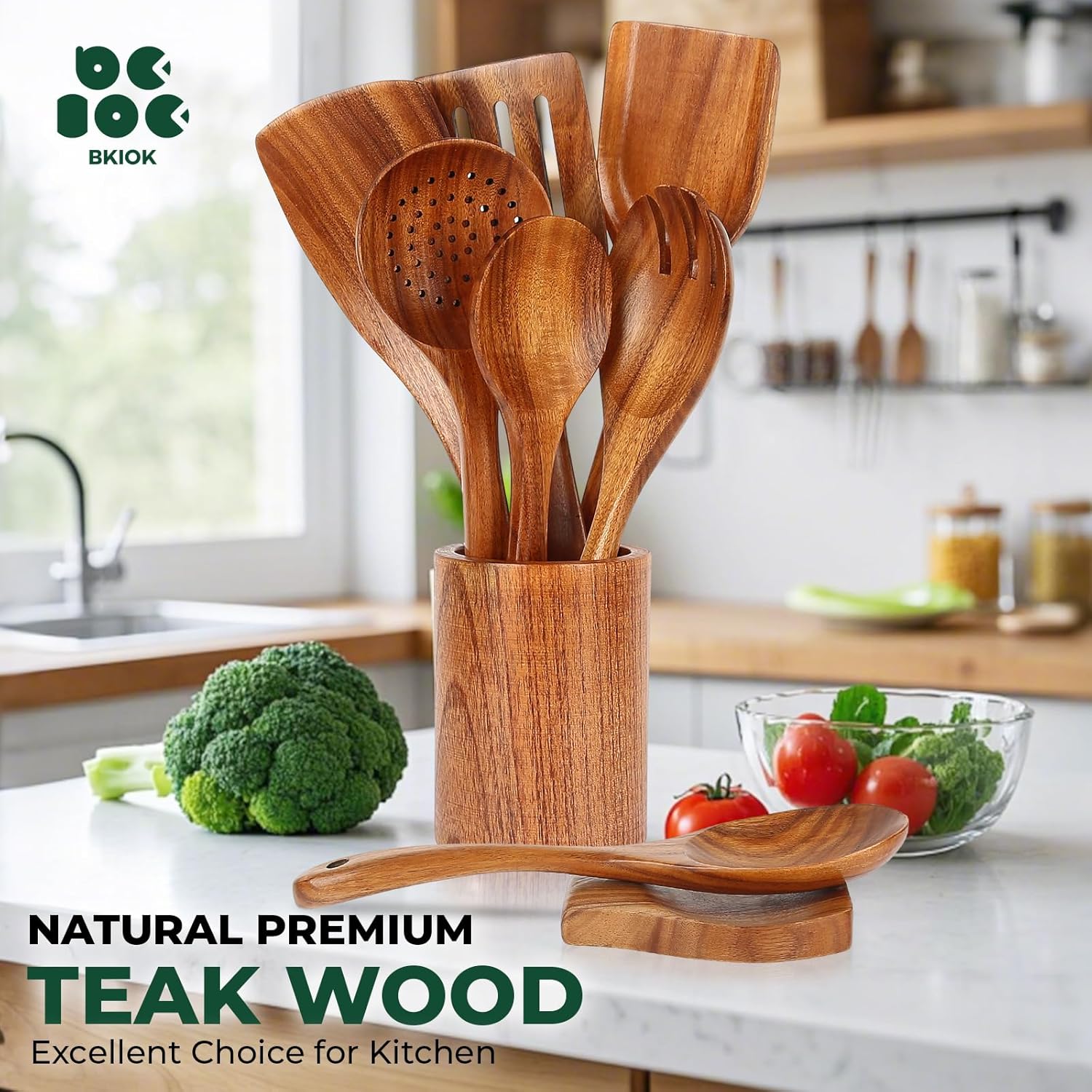 100% TEAK WOOD: This kitchen utensil set is made from durable Teak wood, known for its strength and natural beauty. Designed for daily cooking, these utensils are long-lasting and gentle on your cookware. A perfect addition to your kitchen for everyday use