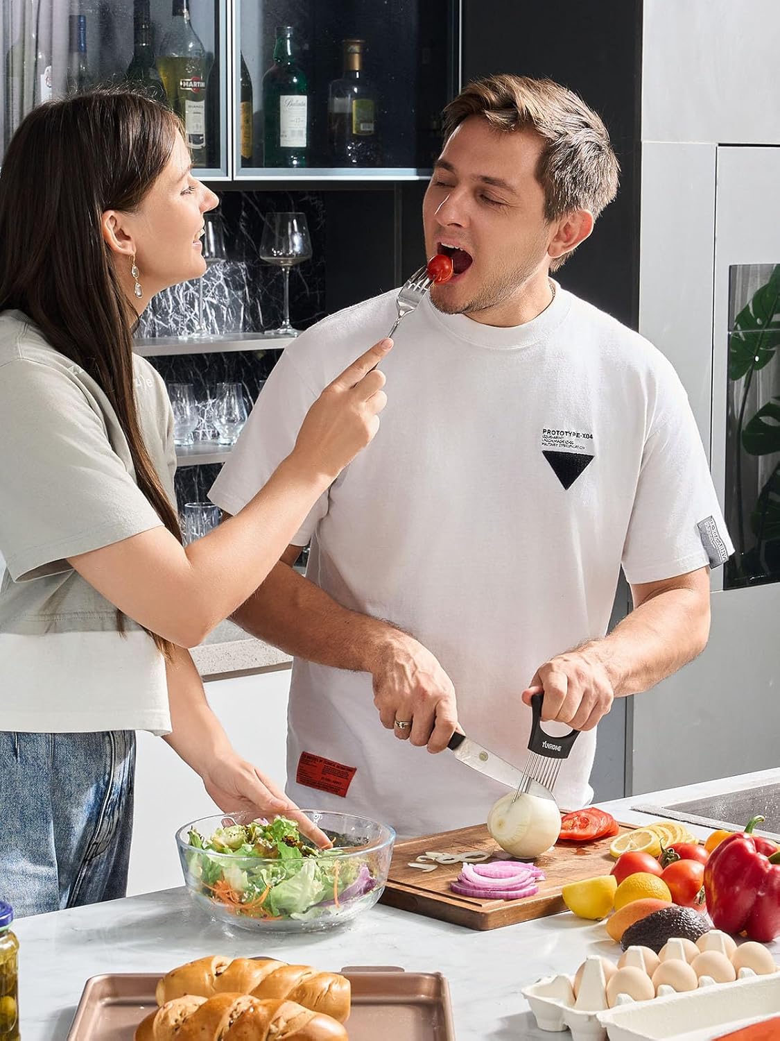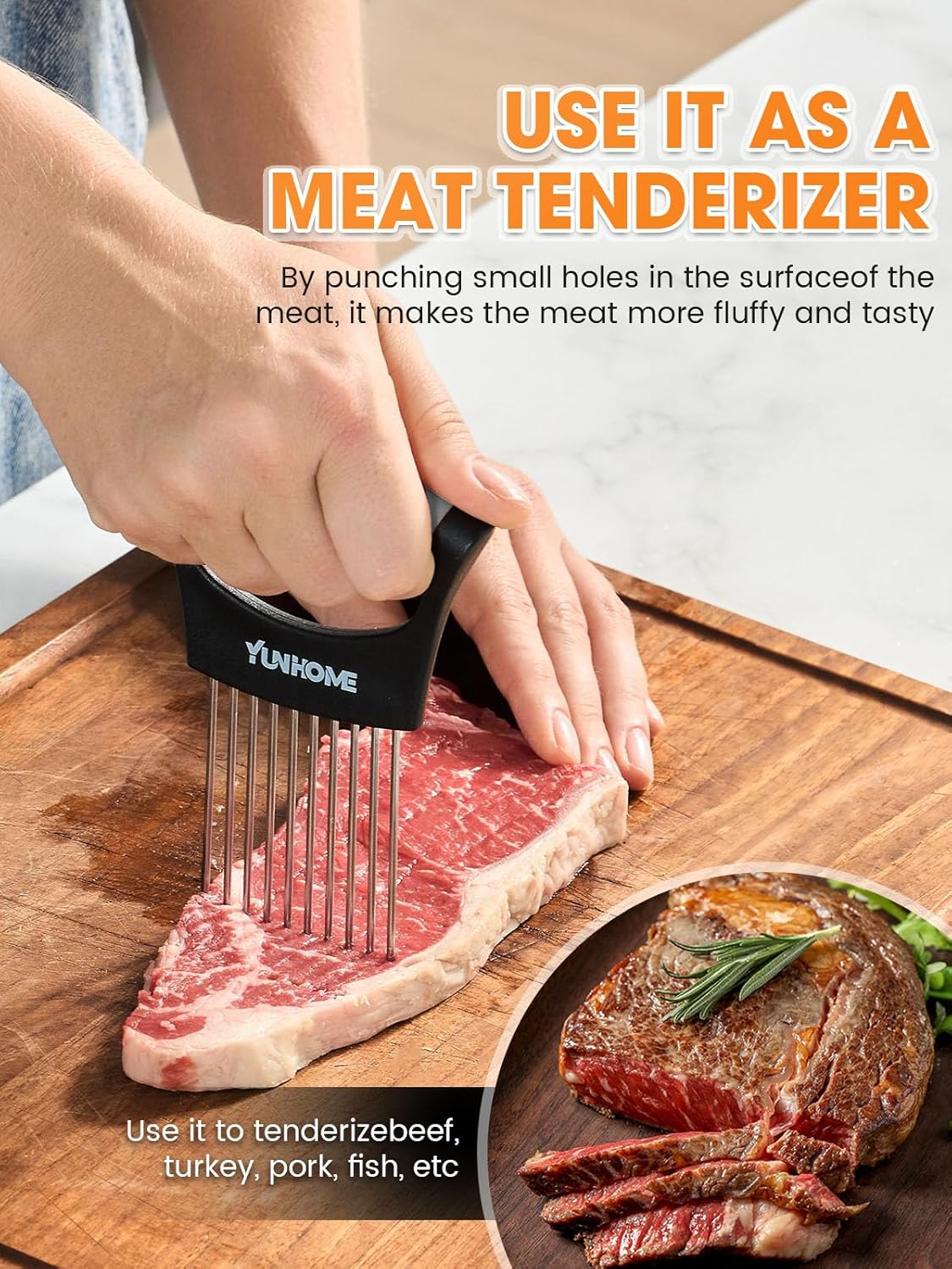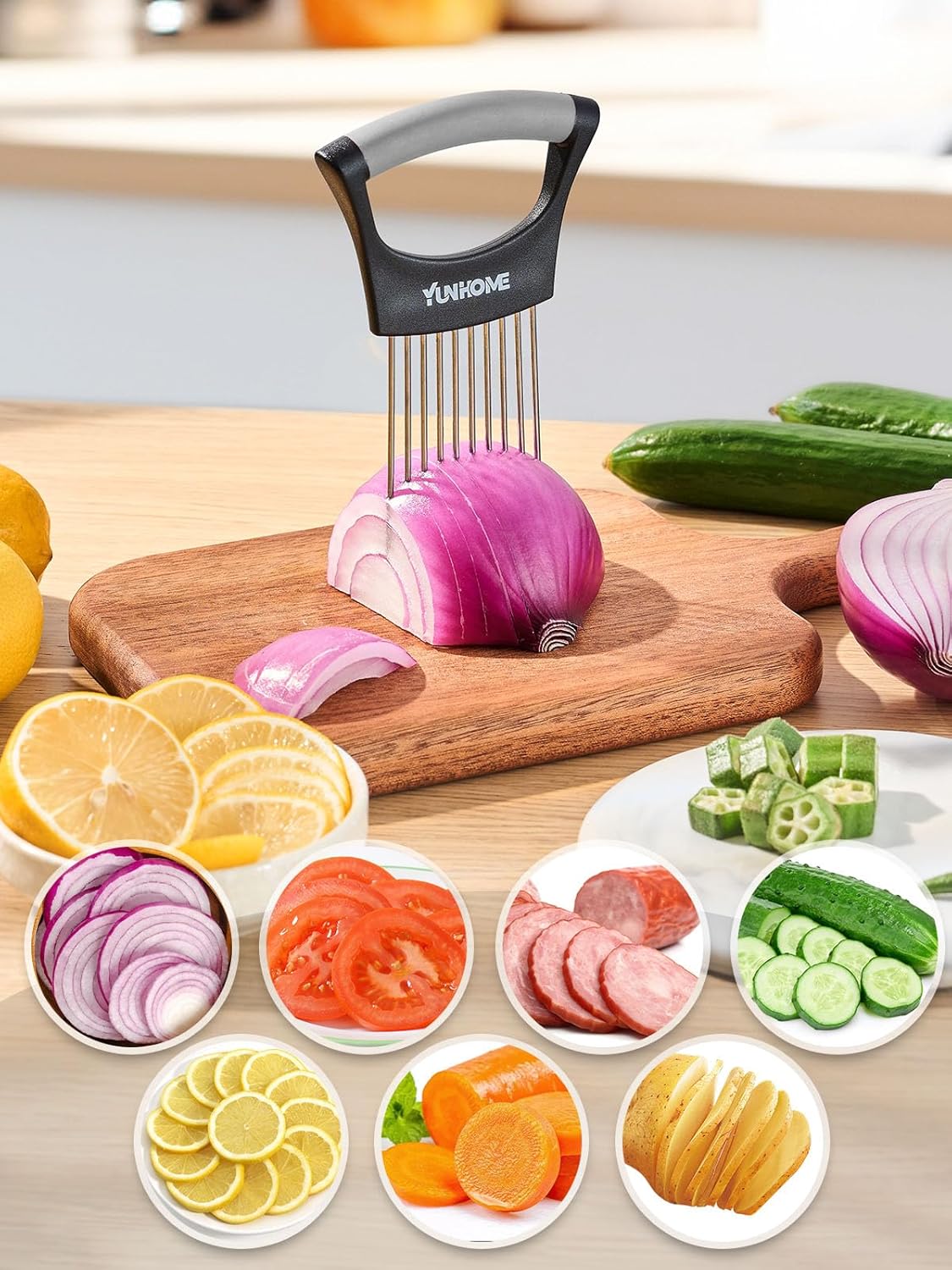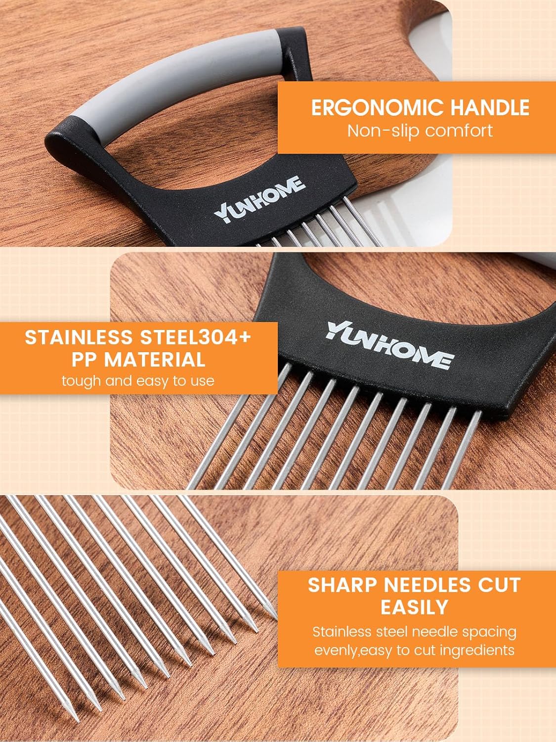 Multifunctional Slicer Tool: YUNHOME Onion Holder Slicer features a unique design with 10 stainless steel forks under the handle, ensuring a secure grip and preventing slippage while cutting. It allows for even and precise slicing of onions, tomatoes, lemons, and meats. Offering a one-stop solution for your slicing needs.The design promotes uniform slicing, enhancing the presentation of your dishes and ensuring even cooking for a professional touch