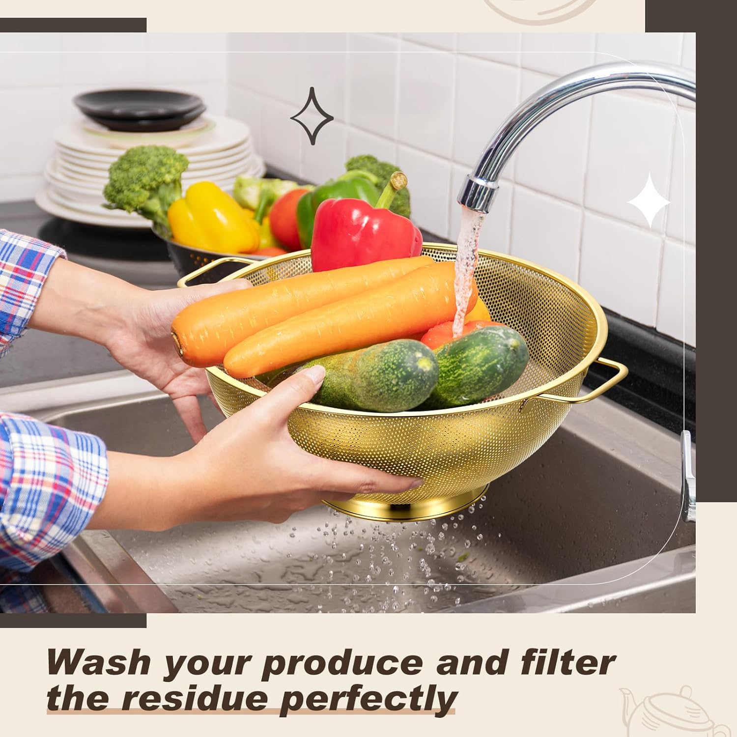 Gold Kitchen Accessories: this package comes with 3 pieces of gold fine mesh strainers and 1 piece of 7 quart gold colander, this combination is nice to meet your daily usage and replacement needs, you can also share them with others