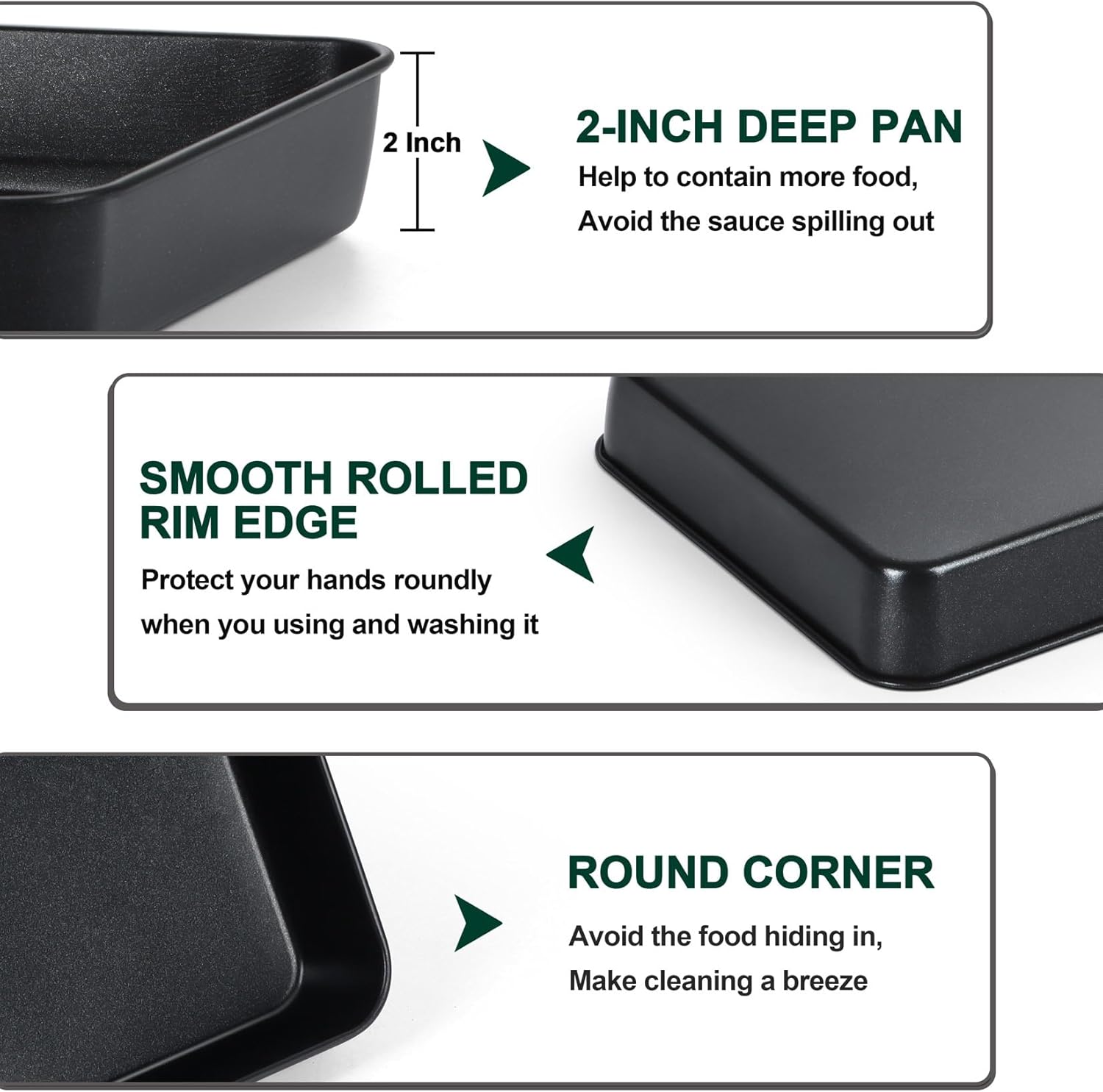 【9.4 INCH BAKING PAN】Rectangular baking pan with size 9.4 x 7 inch, Perfectly fit most toaster ovens, 1.9 Inch deep full sides help to contain more food and sauces, Keep your oven clean, Ideal size for personal use, Smooth rolled rim prevents your hands from hurting when you are using or washing it, Round corners help you clean out the food residue easily
