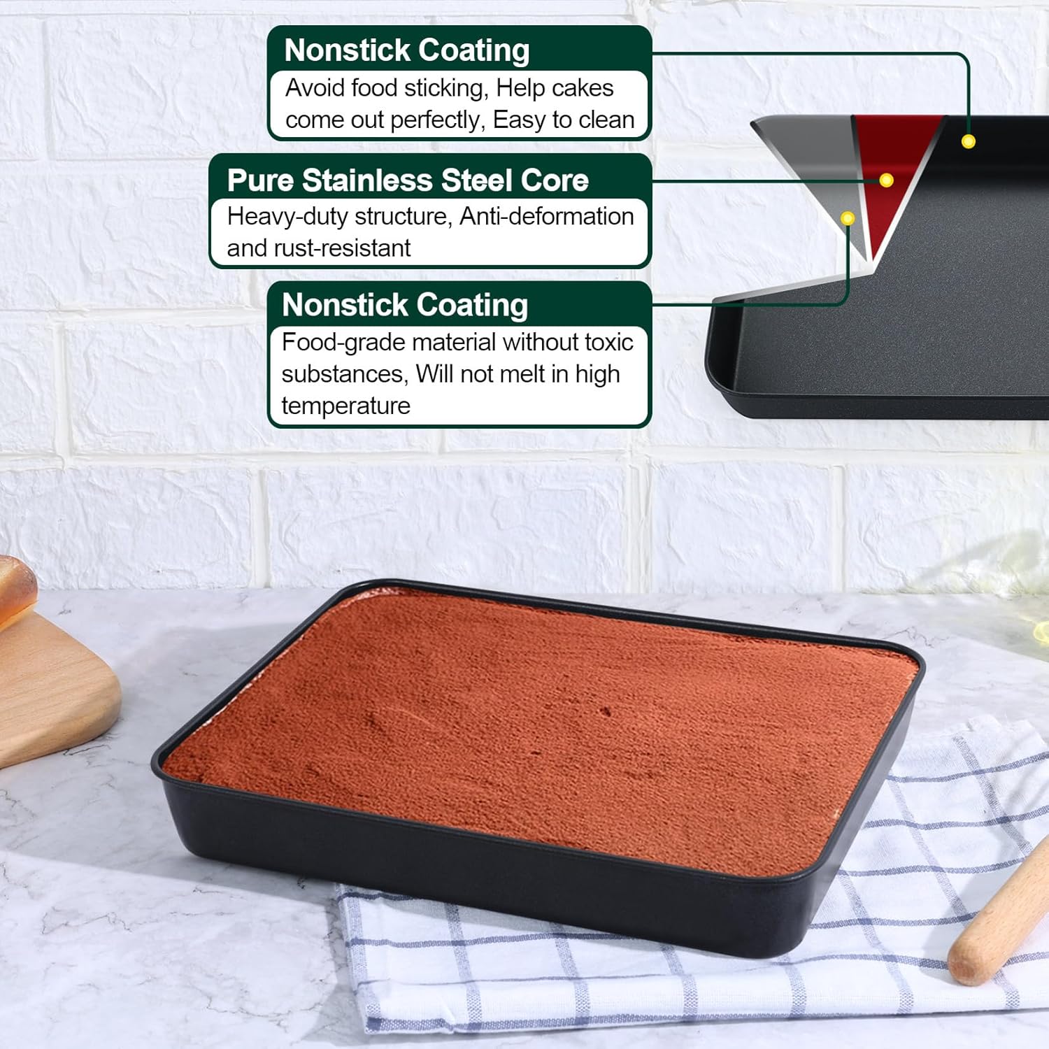 【NONSTICK & EASY TO CLEAN】Rectangular cake pan is coated with healthy non-stick coating, Nonstick and smooth surface efficaciously avoids cake or food sticking on the pan, Allows your cake to be come out easily with perfect shape, Conveniently cleaned by hands with soft sponge and soapy water, Please do not use steel wool to clean it for prolong its service lifetime