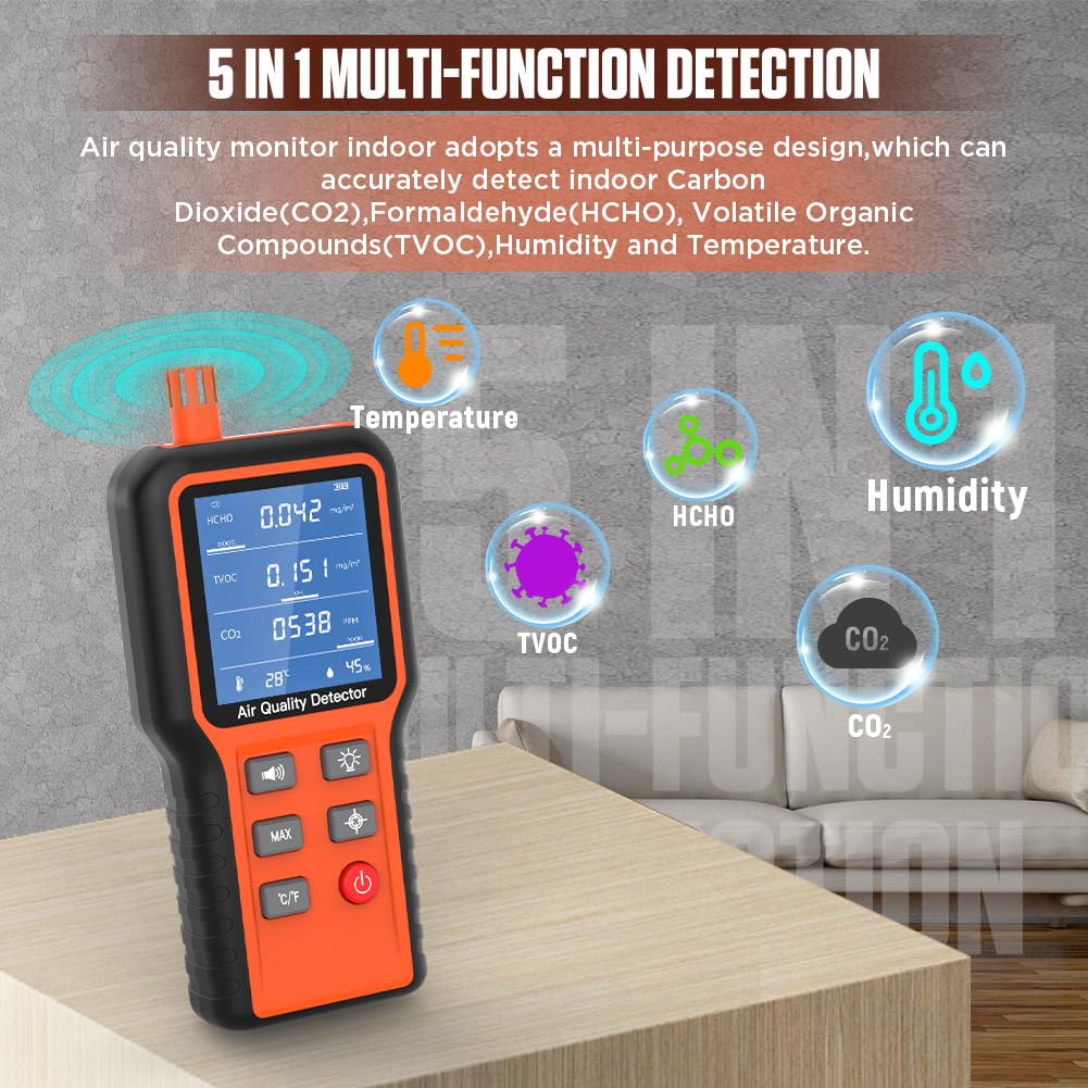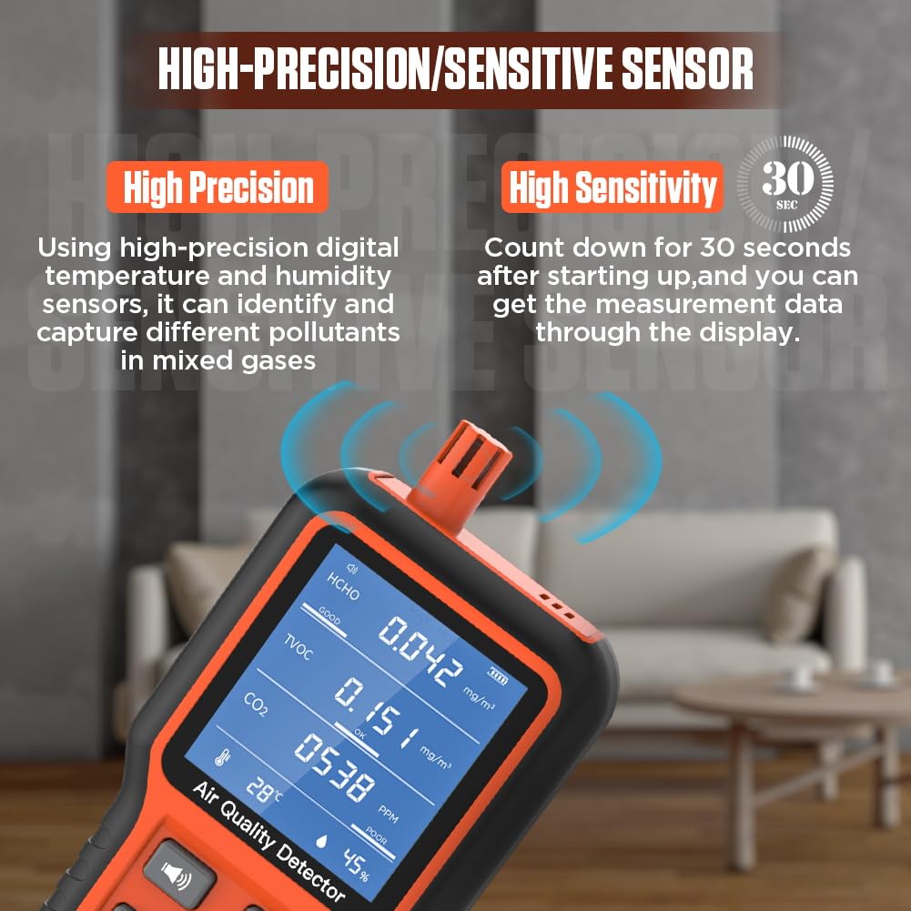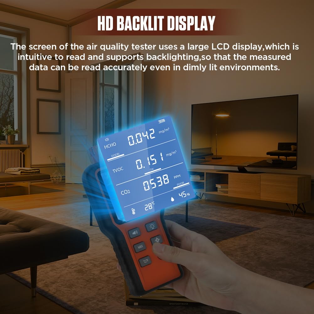 【Widely Used Home Air Quality Tester】Air quality tester for home is widely used,which can be used to detect the indoor air quality of cars,offices,bedrooms,shopping malls,factories,classrooms,new houses or during renovations.Air quality detector is small in size and light in weight,only 250g in weight,so it is easy to carry at will.When the battery power is too low,the battery box will also flash to remind the user,so as to prevent the power off caused by low power