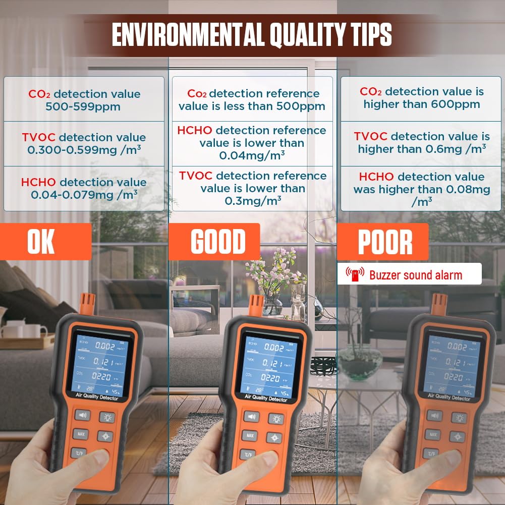 【Smart Reminder & HD Backlight Display】Home air quality tester can detect 3 types of environmental quality(GOOD/OK/POOR),when the air quality is in a bad condition,the buzzer of the air quality tester will sound quickly to remind the user,help users grasp the air quality of the surrounding environment in real time.The screen of the meter uses a large LCD display,which is intuitive to read and supports backlighting,so that the measured data can be read accurately even in dimly lit environments
