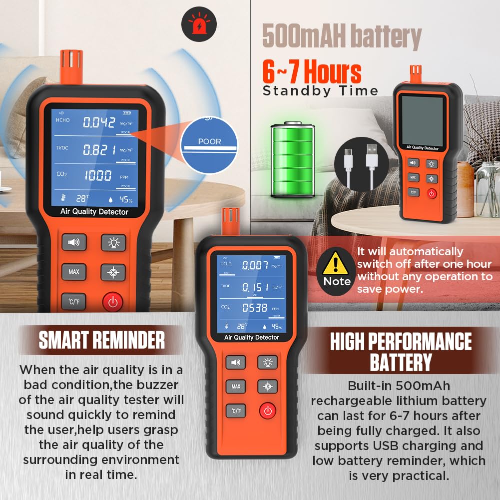 【High-Precision/Sensitive Sensor & High Performance Battery】Air quality tester for home uses a high-precision digital temperature and humidity sensor, which can identify and capture different pollutants in the mixed gas,and the measurement is fast, accurate and sensitive. In addition, the built-in 500mAh rechargeable lithium battery can last for 6-7 hours after being fully charged. Indoor air quality monitor also supports USB charging and low battery reminder, which is very practical