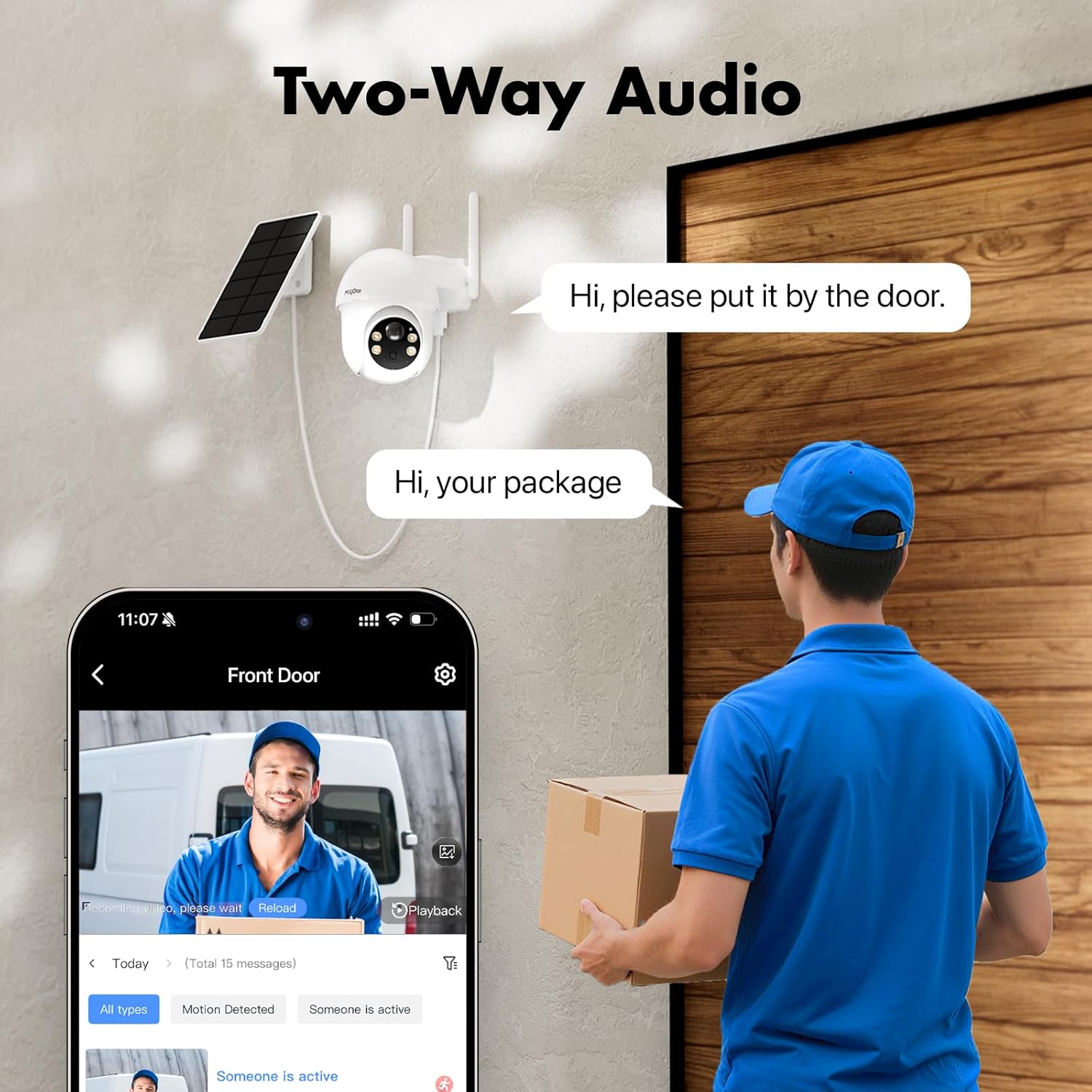 Two-way audio and sound and light alarm: With built-in microphone and speaker, you can communicate with family members near the security cameras wireless outdoor in real time, or drive away uninvited guests. At the same time, the surveillance camera has three alarm modes: sound alarm, light alarm and sound and light alarm, so you can always stay connected and in control.