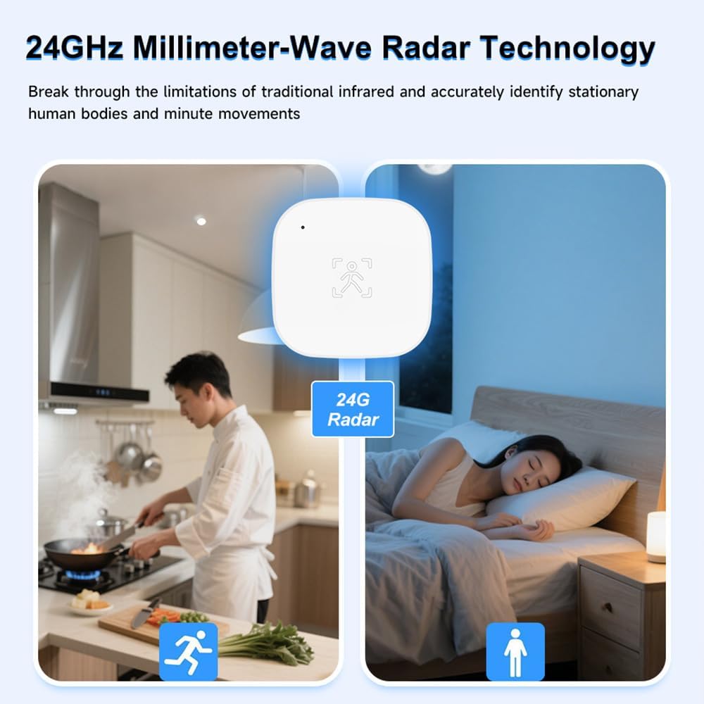 【Smart Human Presence Detector】the human presence sensor adopts 24G millimeter wave radar,sensing human movement and state presence.It can detect the tiniest movement,even breathing. Powered by 2 pcs AAA batteries(not included)