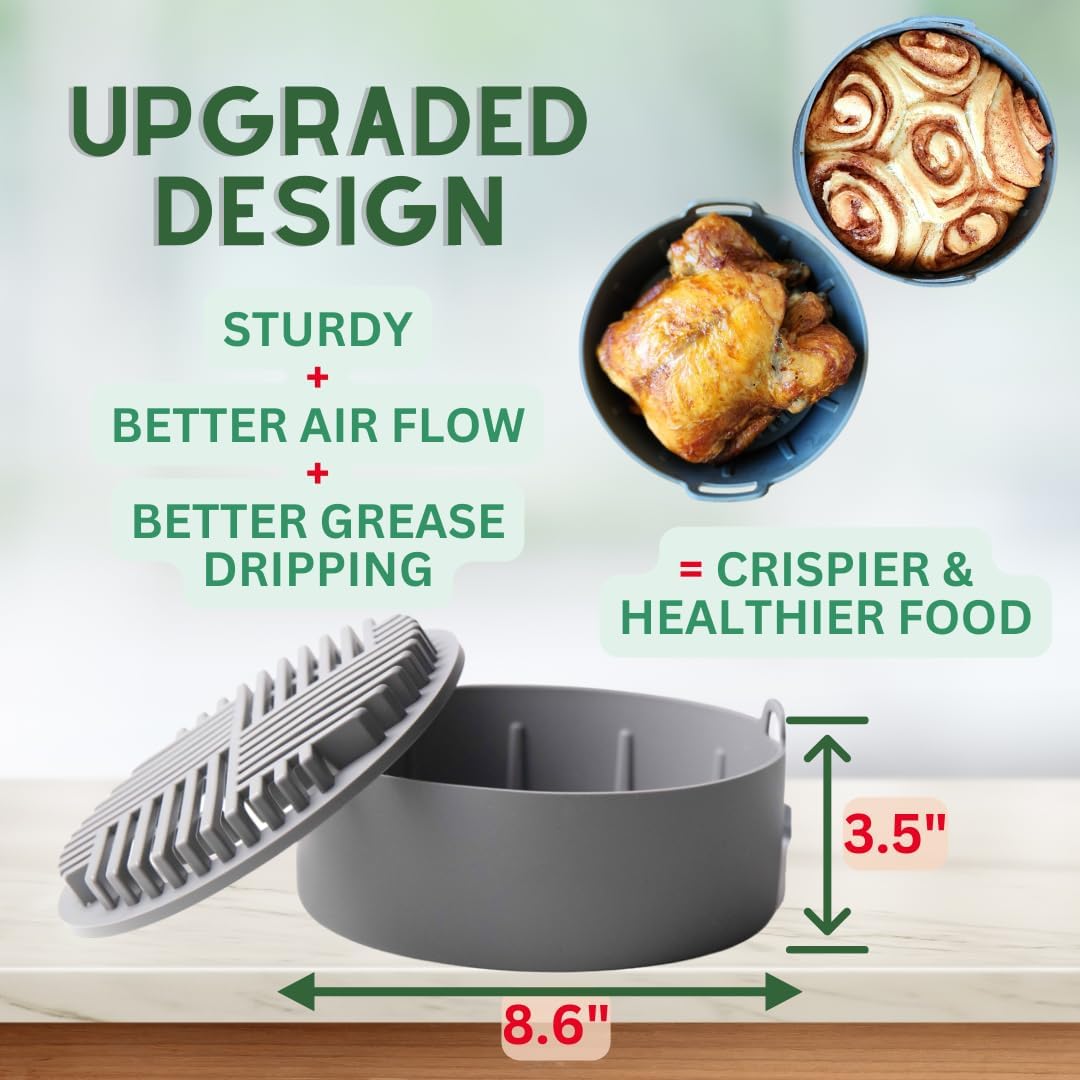 🌟Better Grease Capture & Air Circulation for Crispier food: The Grill Shaped bottom on this air fryer silicone pot keeps food away from dripped grease, so you can enjoy crispy food that’s full of flavor; The silicone air fryer basket also increases air circulation for faster, more uniform cooking; This newly designed air fryer liner is a game changer compared to other airfryer liners.