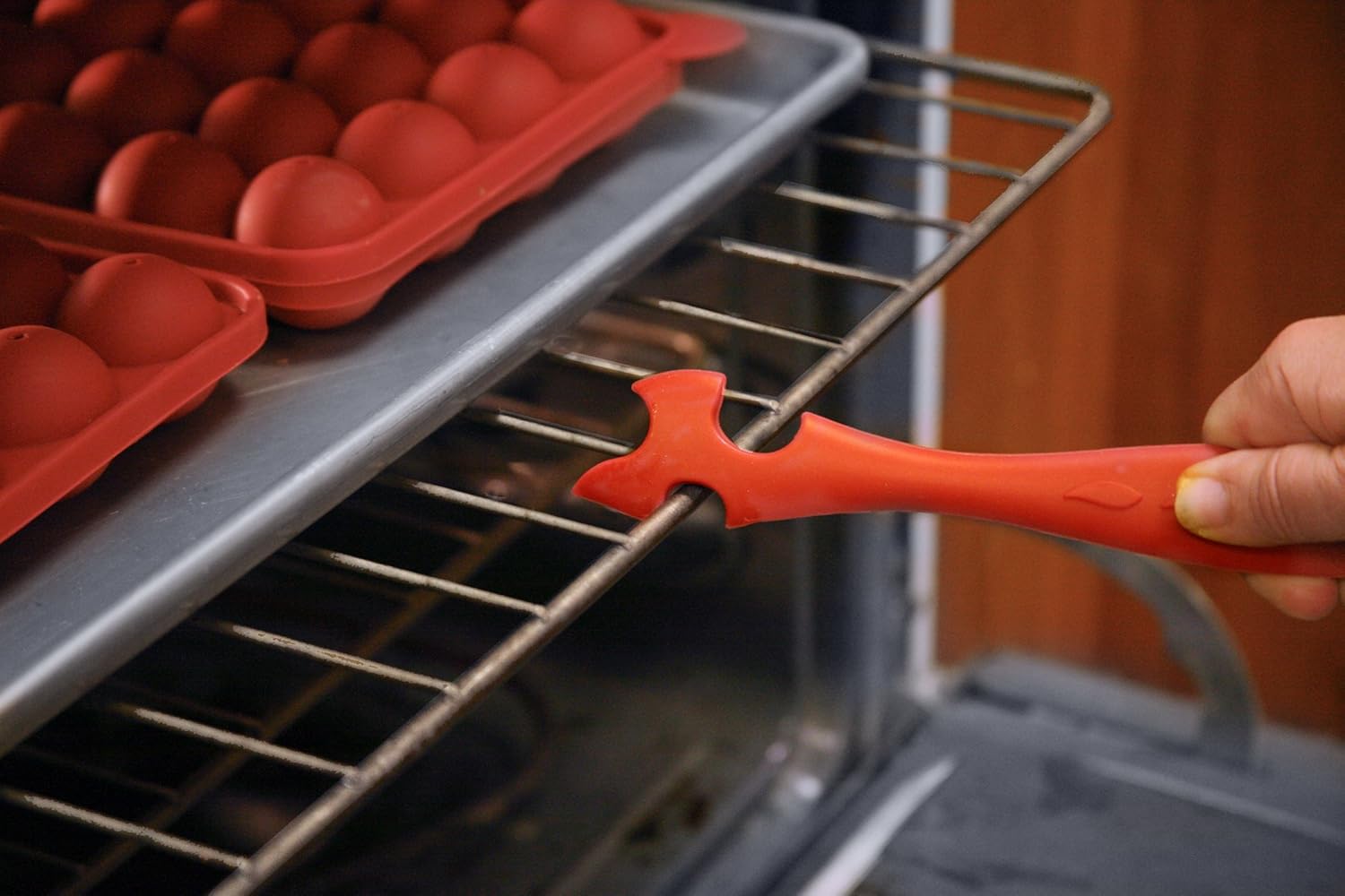 Stay cool handle. Use side notches to pull oven rack or edge of pans towards you. Use the notch on the end to push oven rack or pan back into oven. High heat resistant to 645°F/340°C. 9-inch/23cm.
