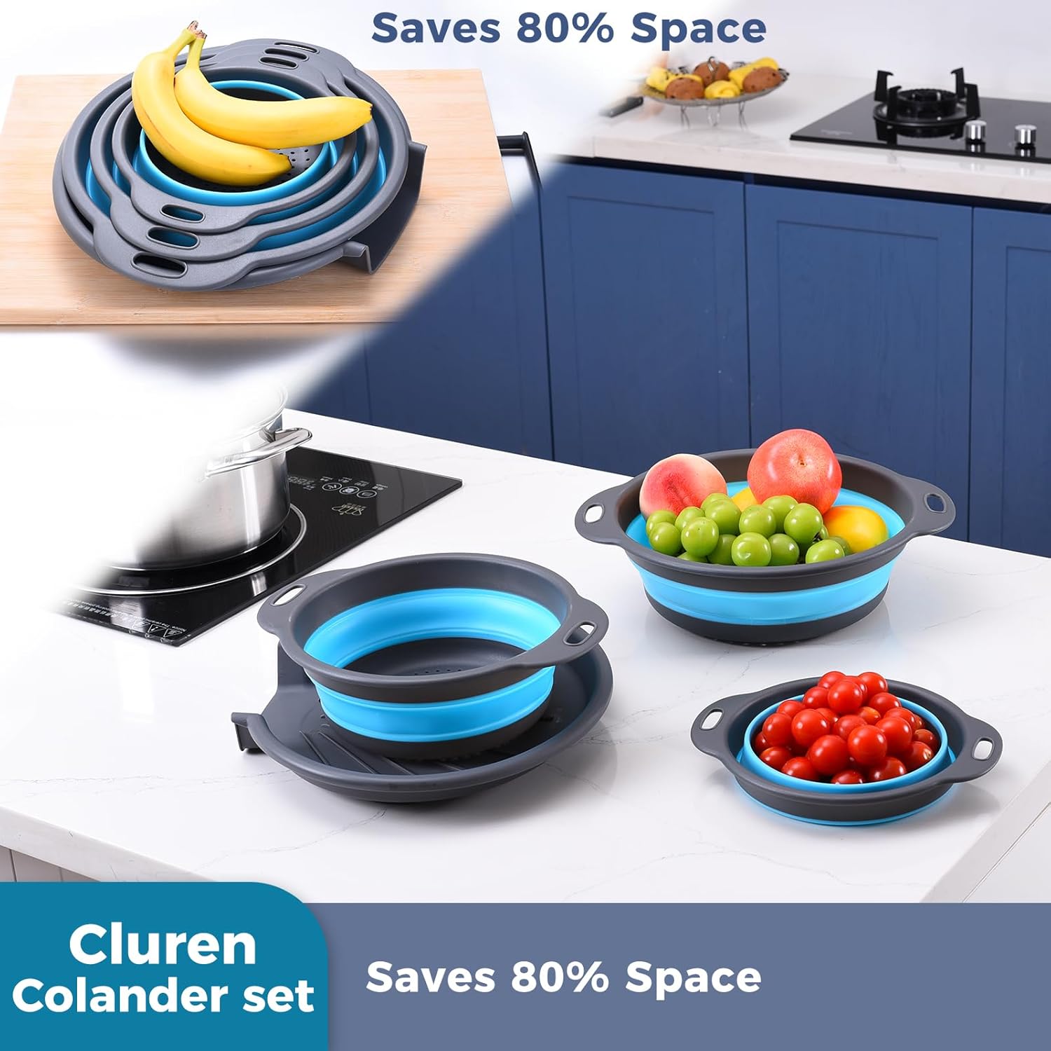 Collapsible Colander Set with Universal Draining Tray | 3-Pack Foldable Kitchen Strainers + Base | Space Saving for Pasta, Veggies, Fruit & Rice | 5 Colors (Gray-Blue)