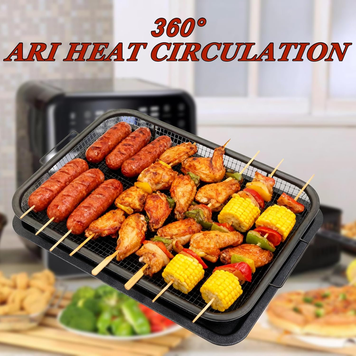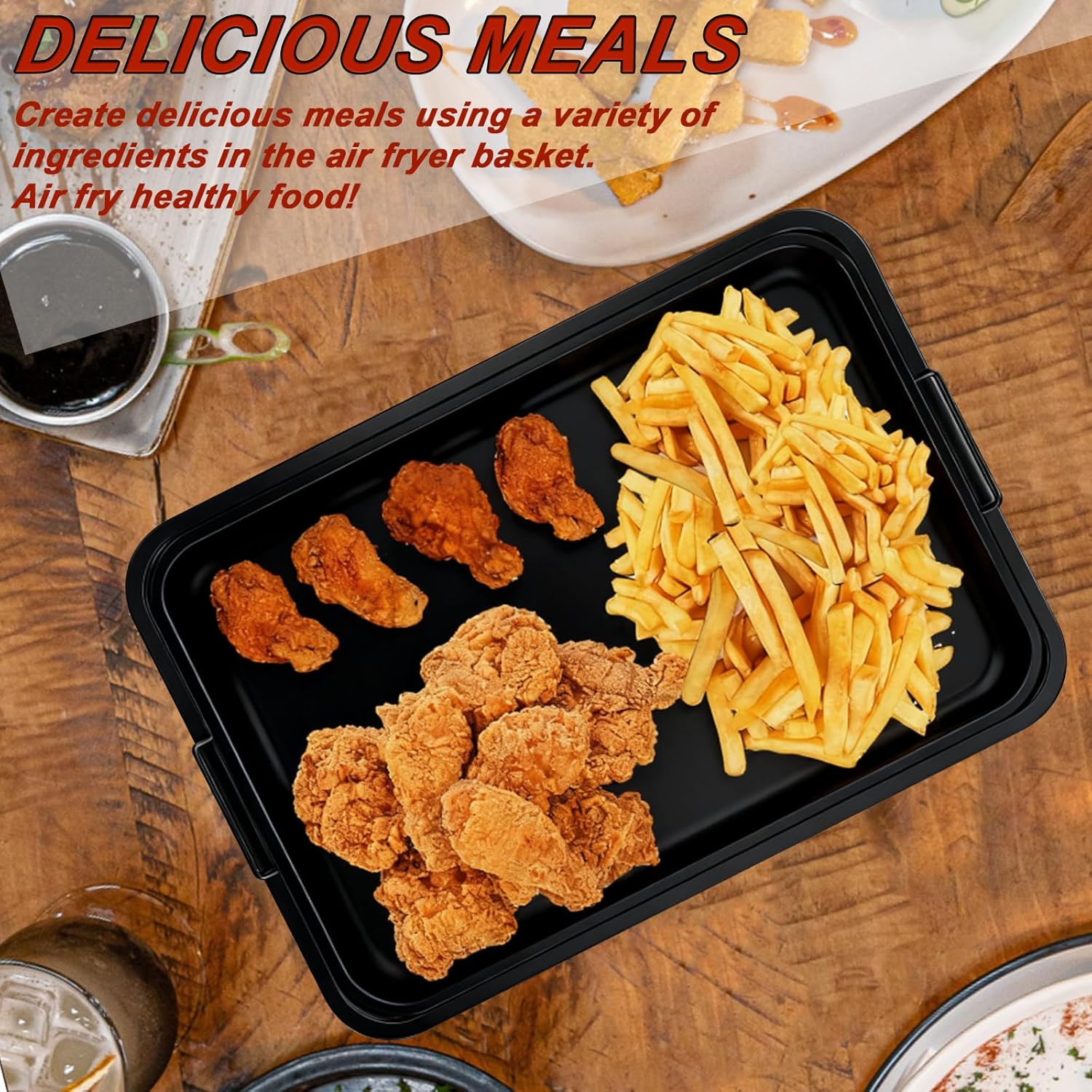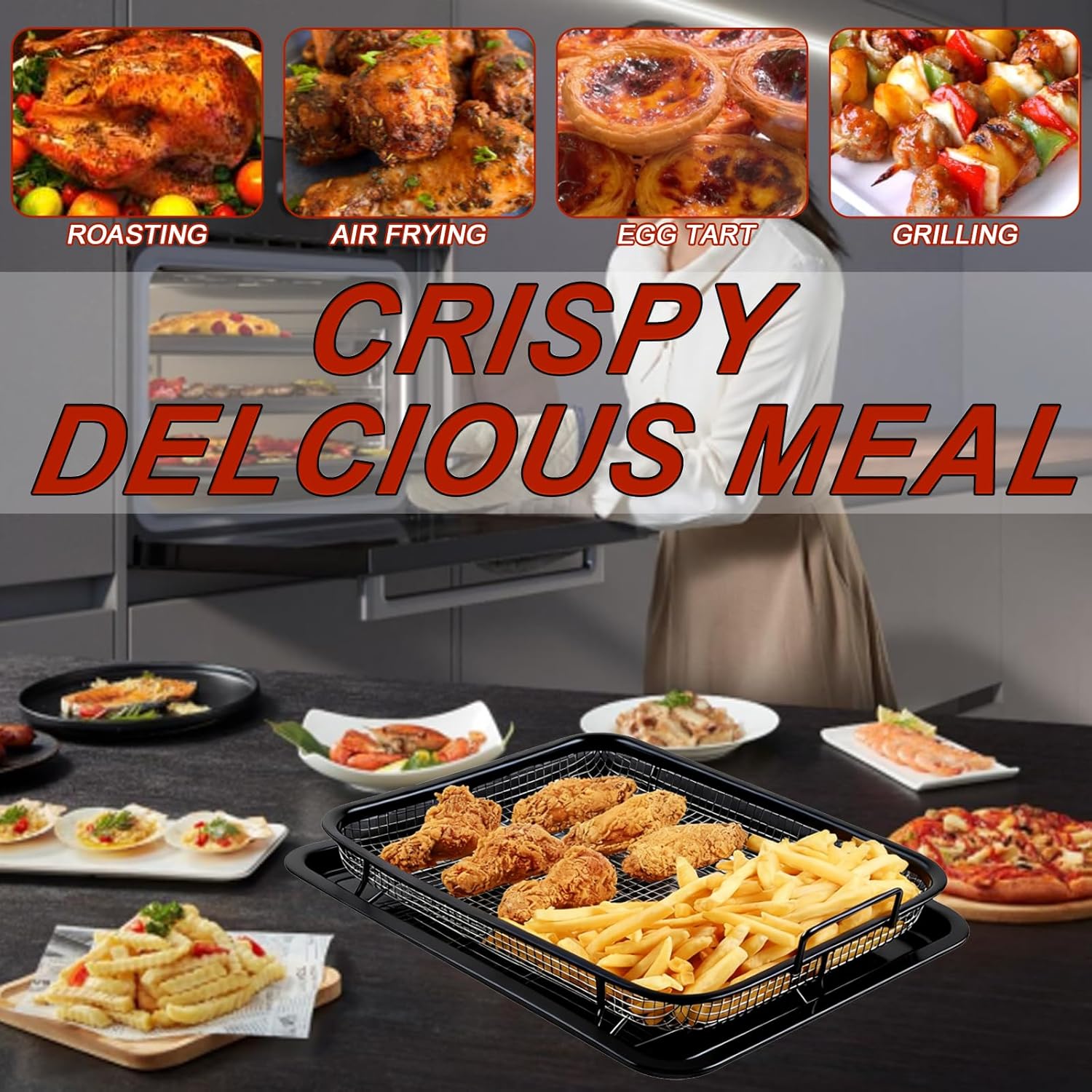 Air Fryer Oven Tray: The baking trays and air fryer baskets With a mesh design, heat the food more evenly and adequately.The elevated mesh basket allows heat to circulate 360° evenly around the food, cooking it to a crispy perfection without burning