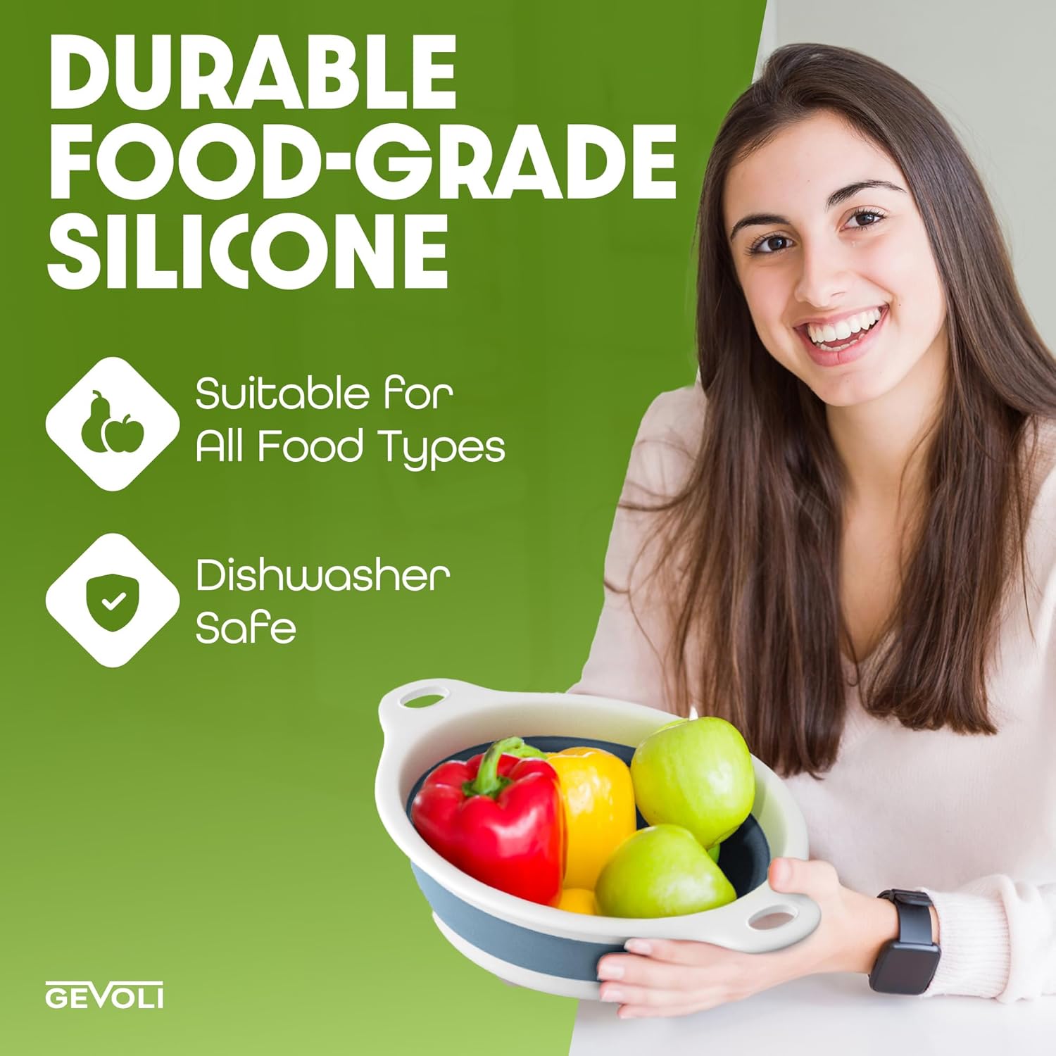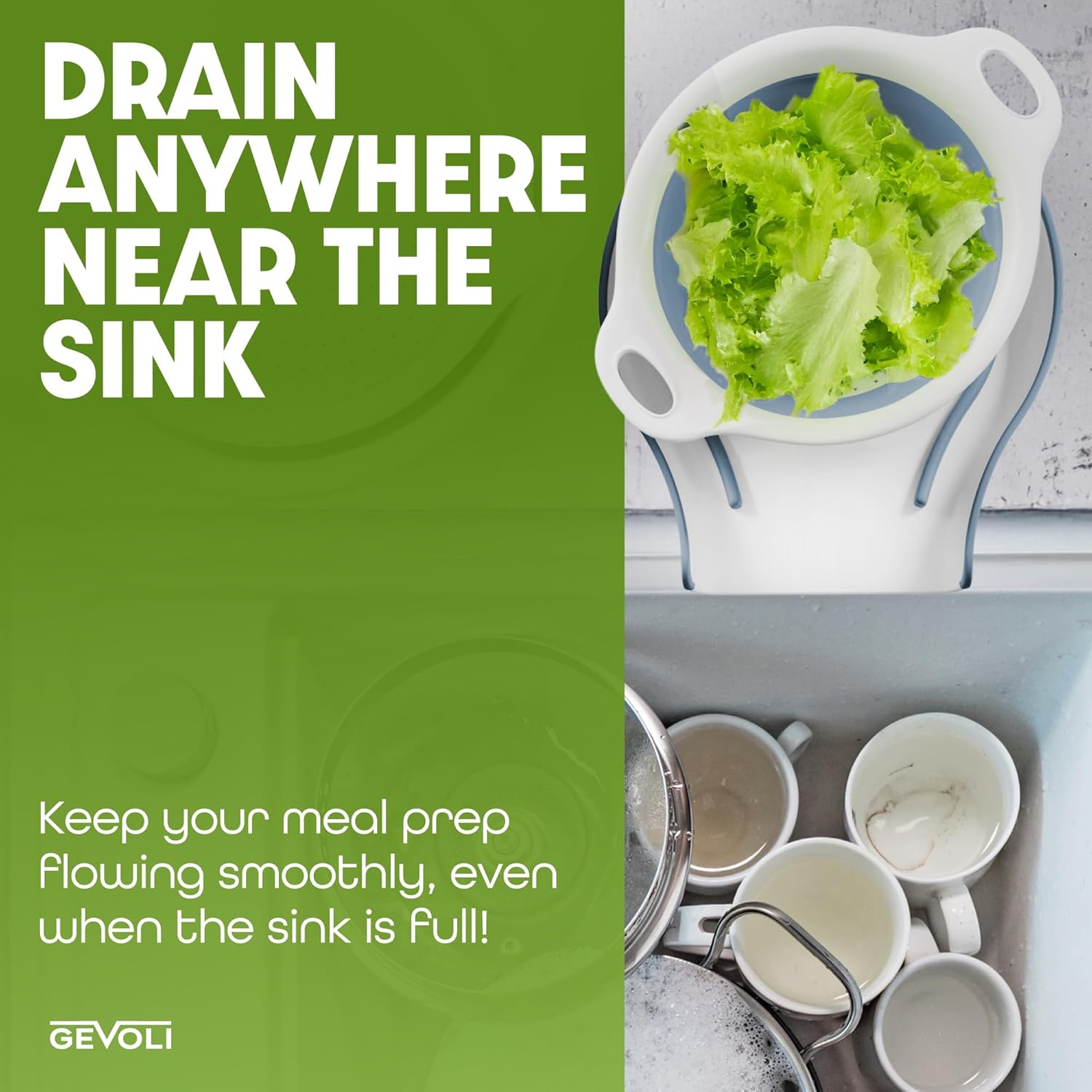 Gevoli Collapsible Colander with Draining Tray (Set of 2) Make effortless work of straining and rinsing in your kitchen with this set of multi-tasking strainers, featuring an innovative self-draining that allows water to drain directly into your sink, even when it’s full! The set includes two different sizes – perfect for rinsing fruits and veggies, straining pasta, or washing off any food item. The slip-resistant base keeps the colander secure and wobble-free on your counter, with a grooved design to ensure safe and mess-free draining, even with hot water. Crafted from dishwasher safe, food-grade materials, this colander boasts a space-saving collapsible design that folds flat for convenient storage.