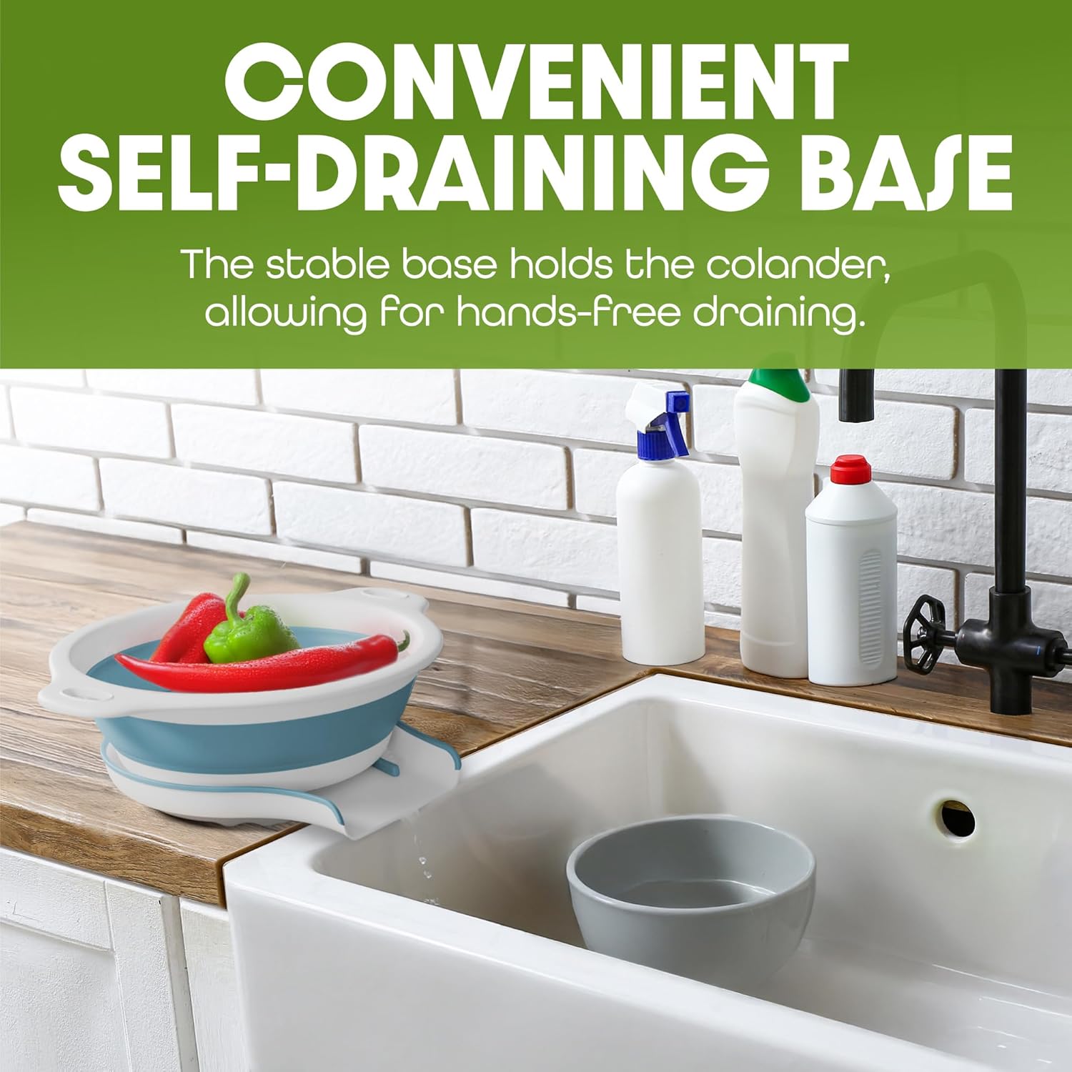 This set of 2 collapsible colanders features an innovative self-draining base that allows water to drain directly into your sink, even when it’s full.