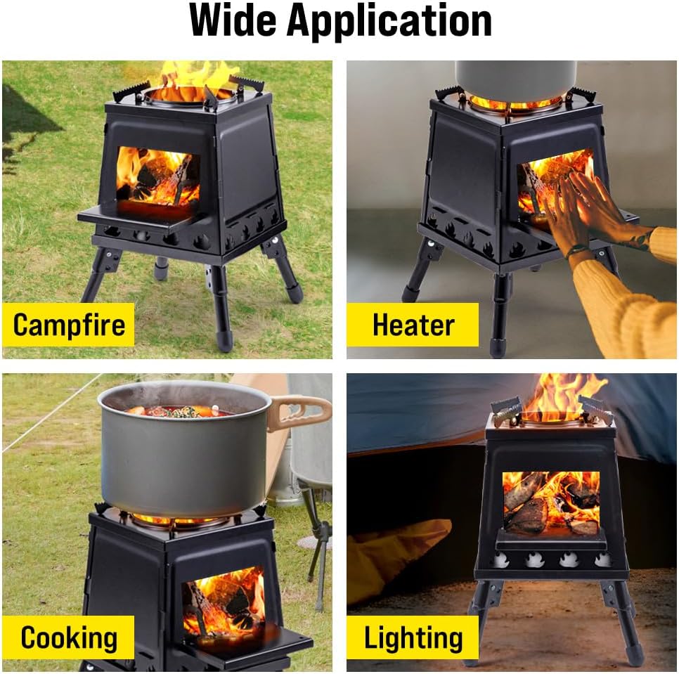 Wide Applications: The lightweight camping wood stove is suitable for different fuel sources like wood, straw, charcoal, etc; Perfect for picnic, hiking, camping, survival, backpacking; Suitable for BBQ, boiling and cooking