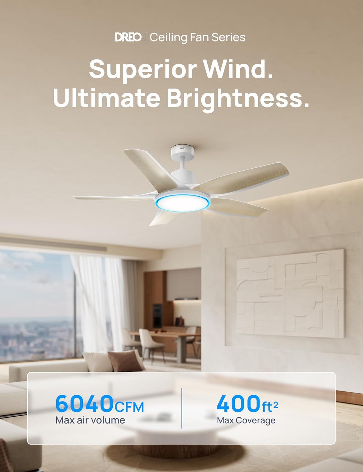 Cool comfort exactly how you want it: This low-profile ceiling fan with lights delivers powerful 6040 CFM (average 4231 CFM) airflow at less than 45dB. Pick from 6 speeds and 3 modes (Sleep, Natural, or Auto), or fine-tune with 12 app-adjustable speeds. Powerful, versatile, and tailored to you.