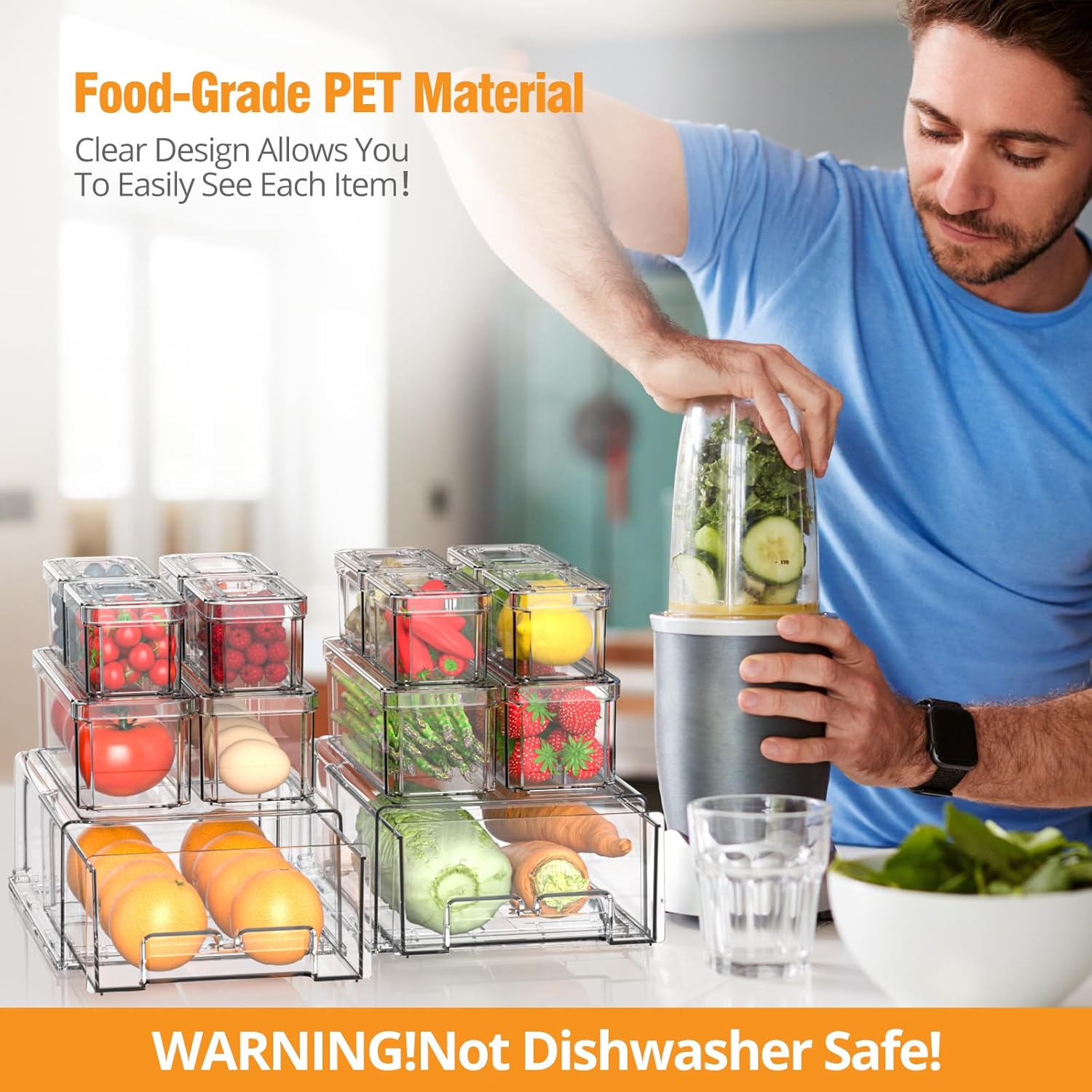 CLEAR DESIGN ALLOWS YOU TO EASILY SEE EACH ITEM : The fruit storage containers for fridge is made of food-grade PET material with transparency comparable to glass. You can clearly see each item in the refrigerator organizer bins, say good bye to food going to waste because you don’t see it. Perfect for storing fruit, vegetables, and more while saving space