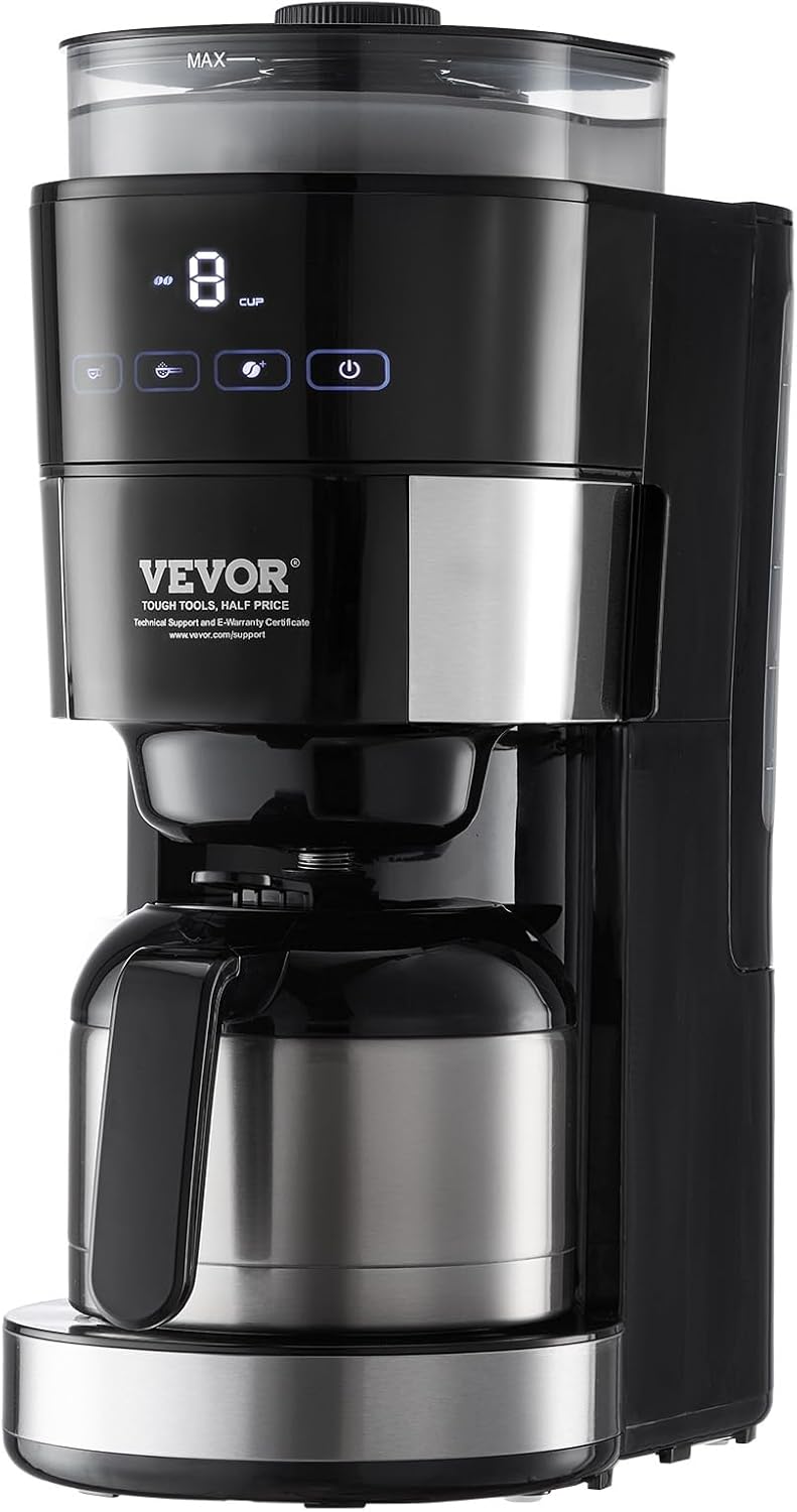 VEVOR Coffee Maker with Grinder, 8 Cup Programmable Coffee Machine, Grind and Brew Coffee Maker with 3 Brew Strength Control, Reusable Filter, Removable Water Tank, for Home Office Restaurant