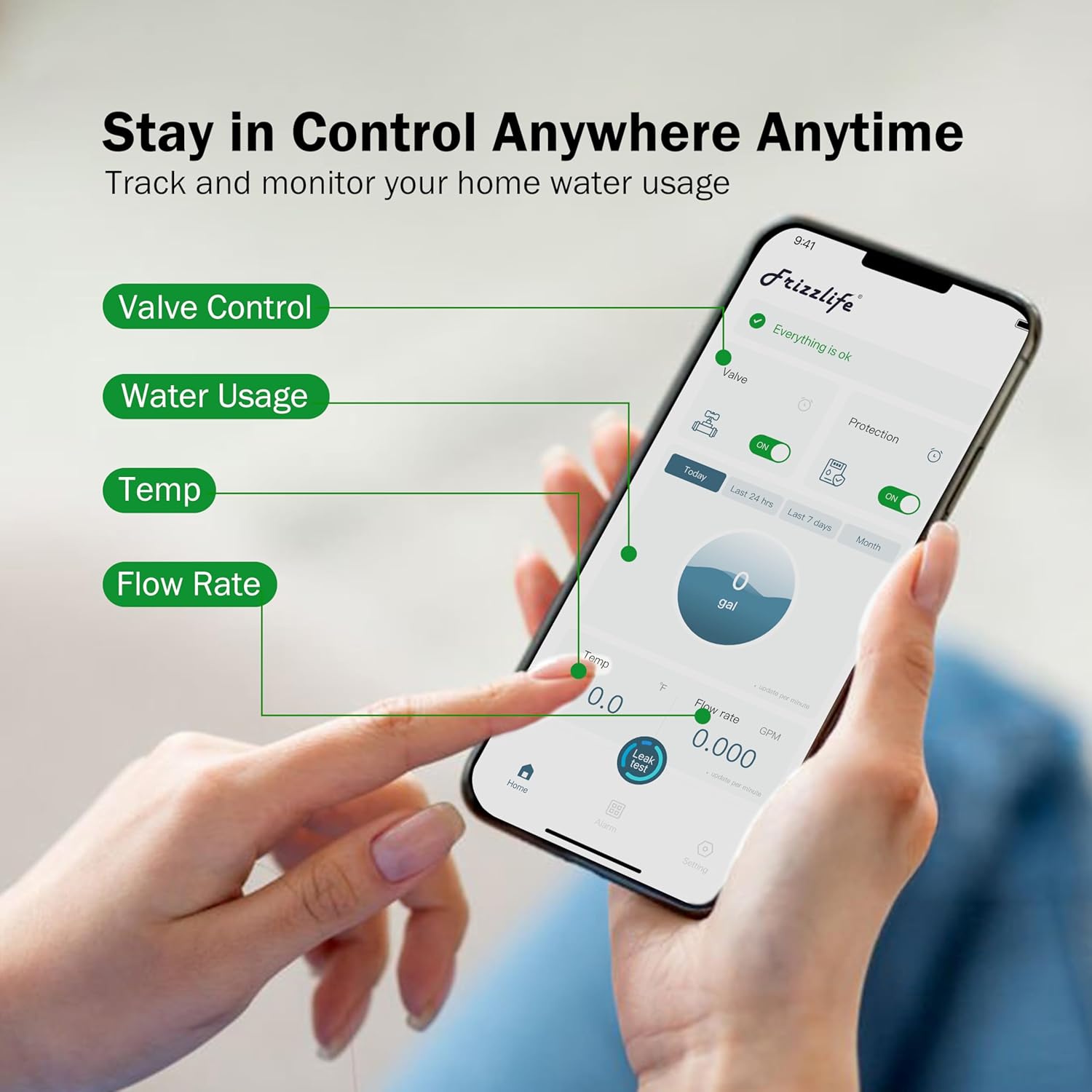 [Real-Time Alerts&Notifications, Wherever You Are]–Stay connected and informed, 24/7. in the event of a leak or even a minor risk, frizzlife sends alerts via sms, phone calls, and app notifications, and automatically closes the valve to prevent further damage. whether you’re home or away, you’re always in control.