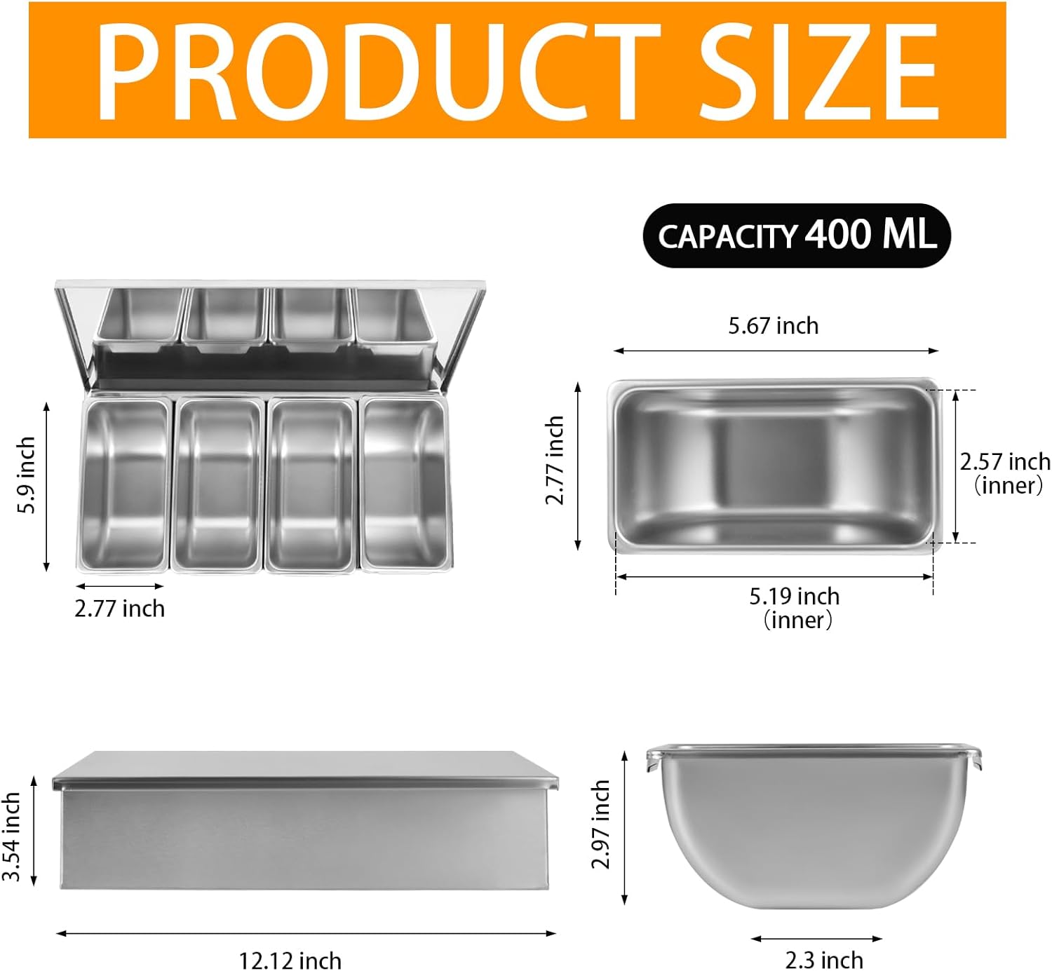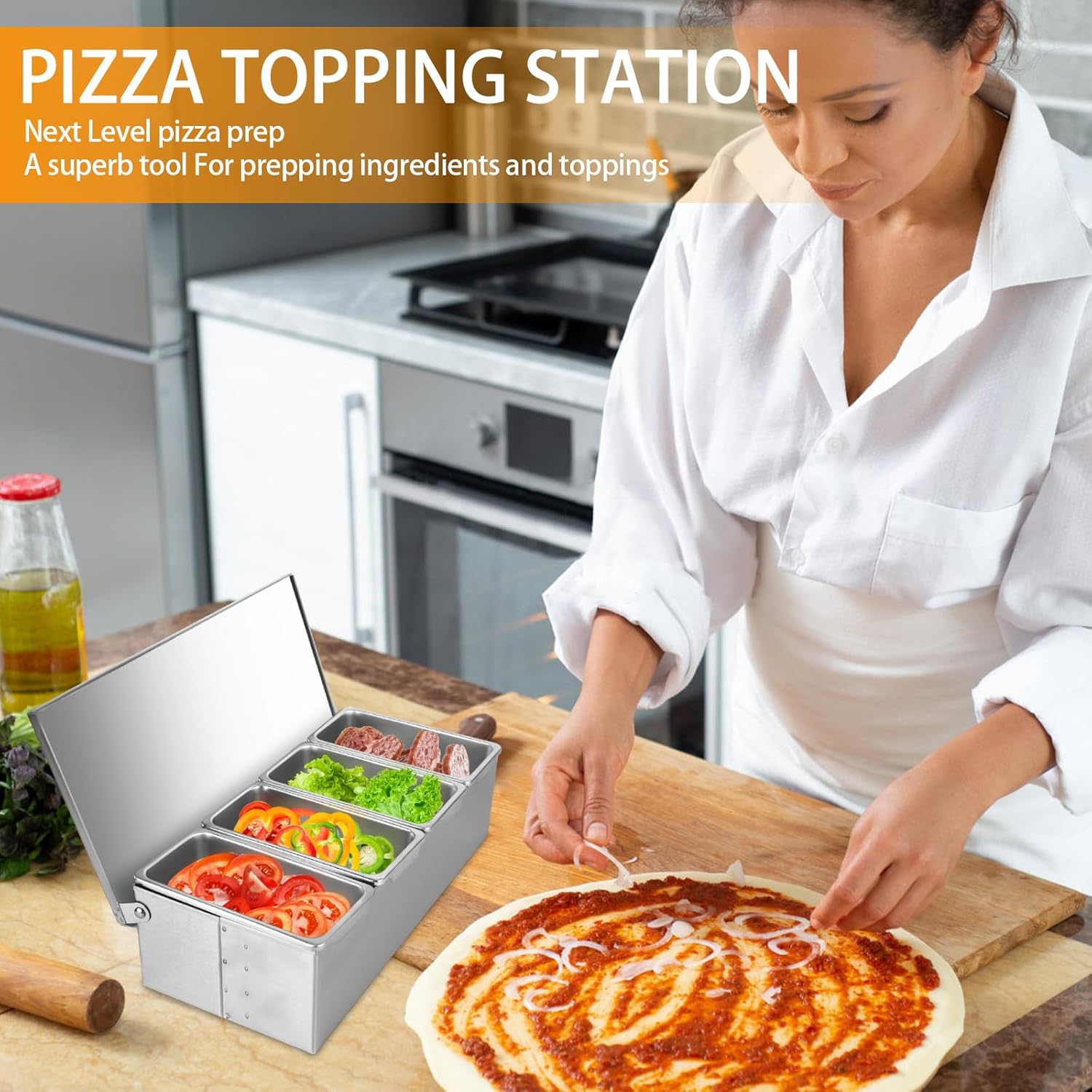 Size And Design: Pizza topping station is equipped with 4 detachable food boxes, each box measures 14.4 cm/5.67inches long, 7.04 cm/2.77 inches wide, 7.55 cm/2.97 inches high, with a capacity of 0.4 liters, suitable for storing ingredients. In addition, the pizza topping station is equipped with a dustproof cover to ensure the cleanliness and freshness of the food.