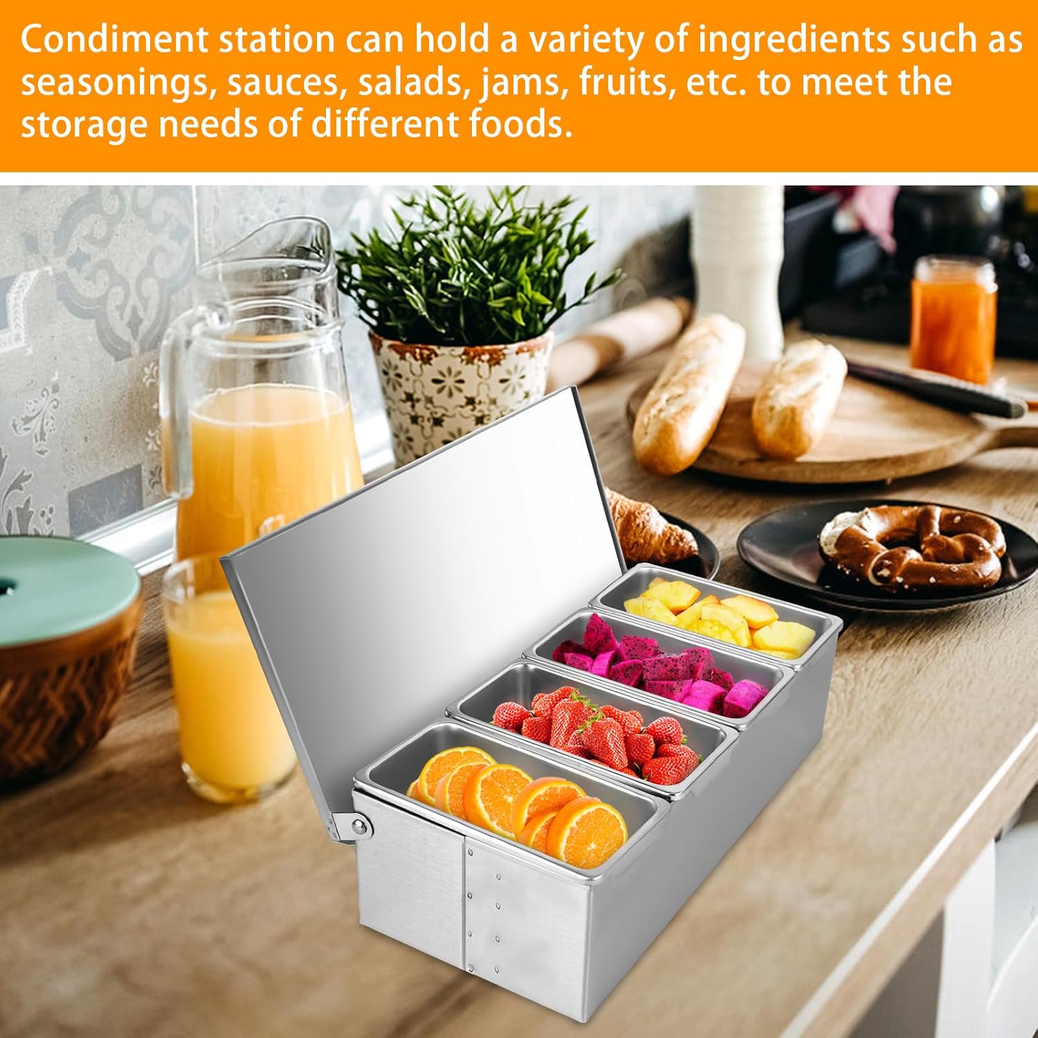Pizza topping station, with its stainless steel durability and good high and low temperature resistance, is a good choice for home and commercial kitchens. Stainless steel pizza topping station is cleverly designed and equipped with 4 removable food boxes with dust covers, which not only ensure the cleanliness and freshness of the ingredients, but also facilitate cleaning and maintenance. Each food box can hold a rich variety of seasonings, sauces, salads, etc., to meet the storage needs of various occasions. Whether it is a family dinner, banquet hall, buffet or commercial restaurant, this condiment station can provide a flexible and convenient food distribution solution, making the cooking and dining experience more enjoyable.