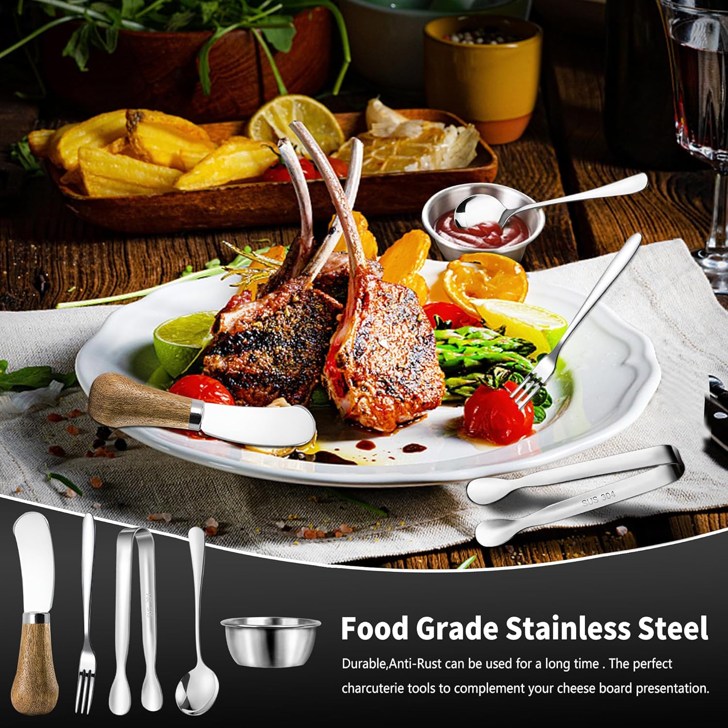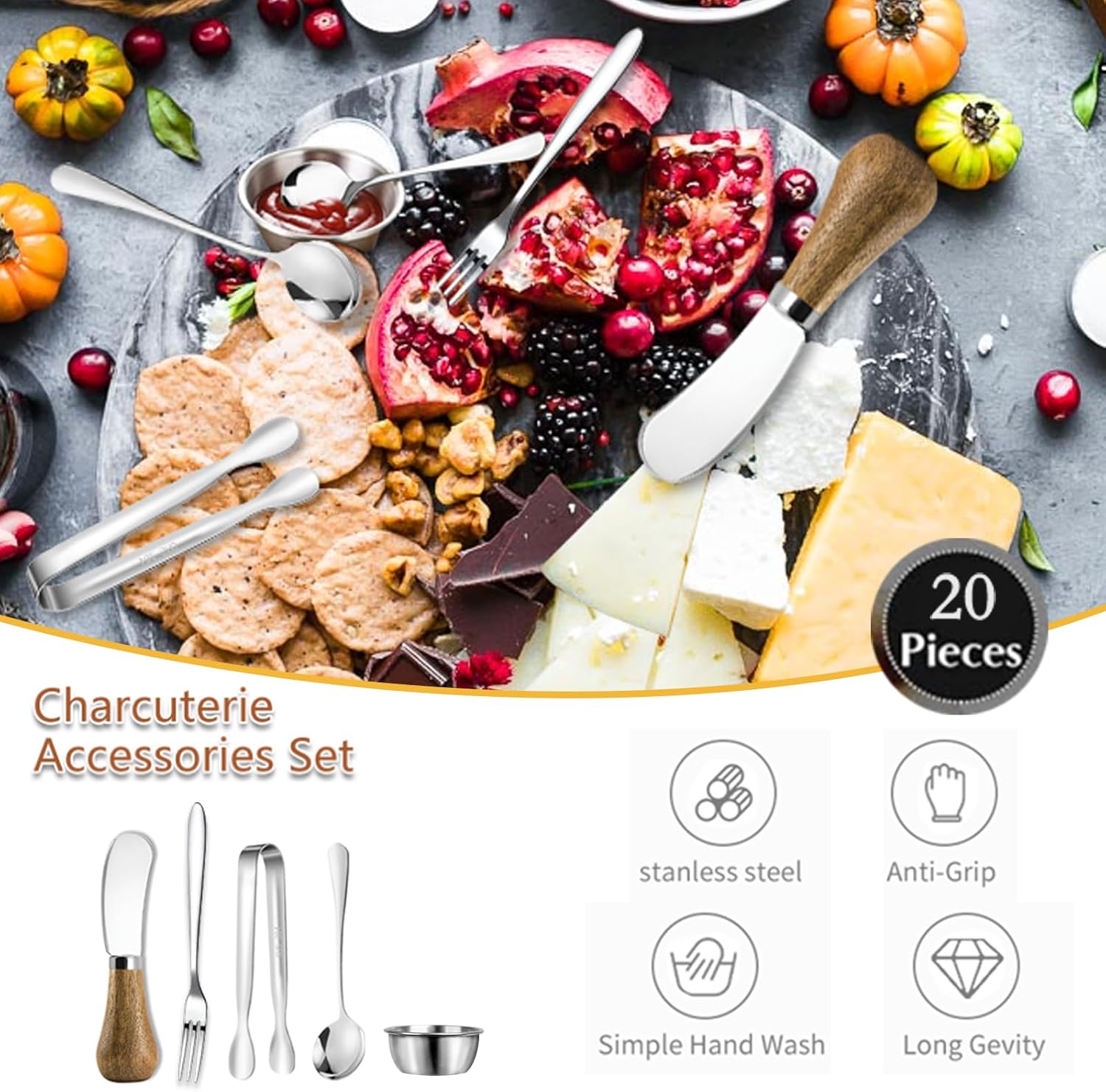 Elevate Your Spread with 20pcs Essential Tools : Package comes with 4pcs update standing wooden-handle cheese spreader knives, 4x mini forks, 4x mini spoons, 4x mini tongs, 4xmini dipping bowls.These tools are more than mere utensils; they are the keys to unlocking the full potential of your charcuterie experience. We can help you find the amazing charcuterie tools to complement your cheese board presentation