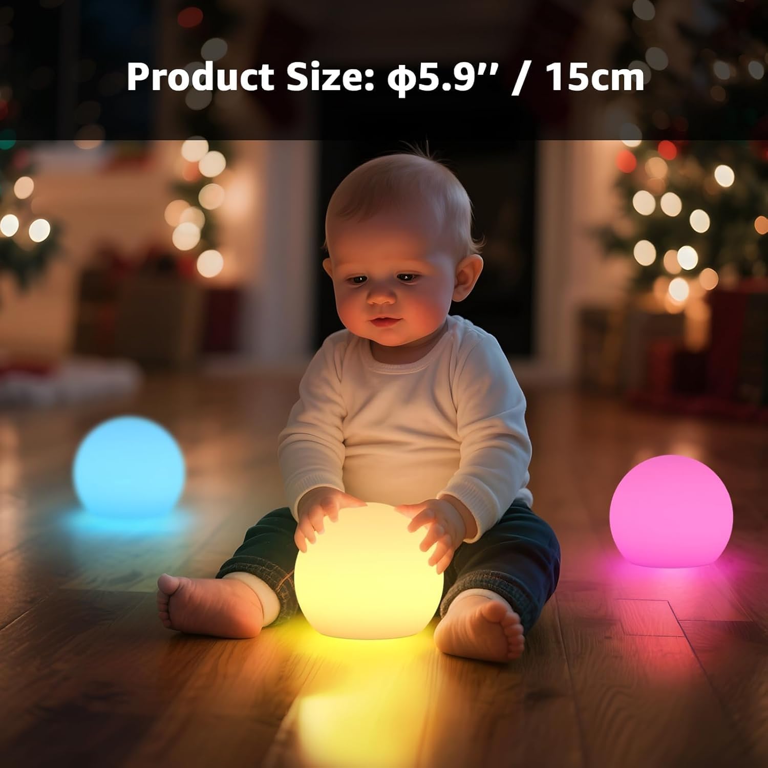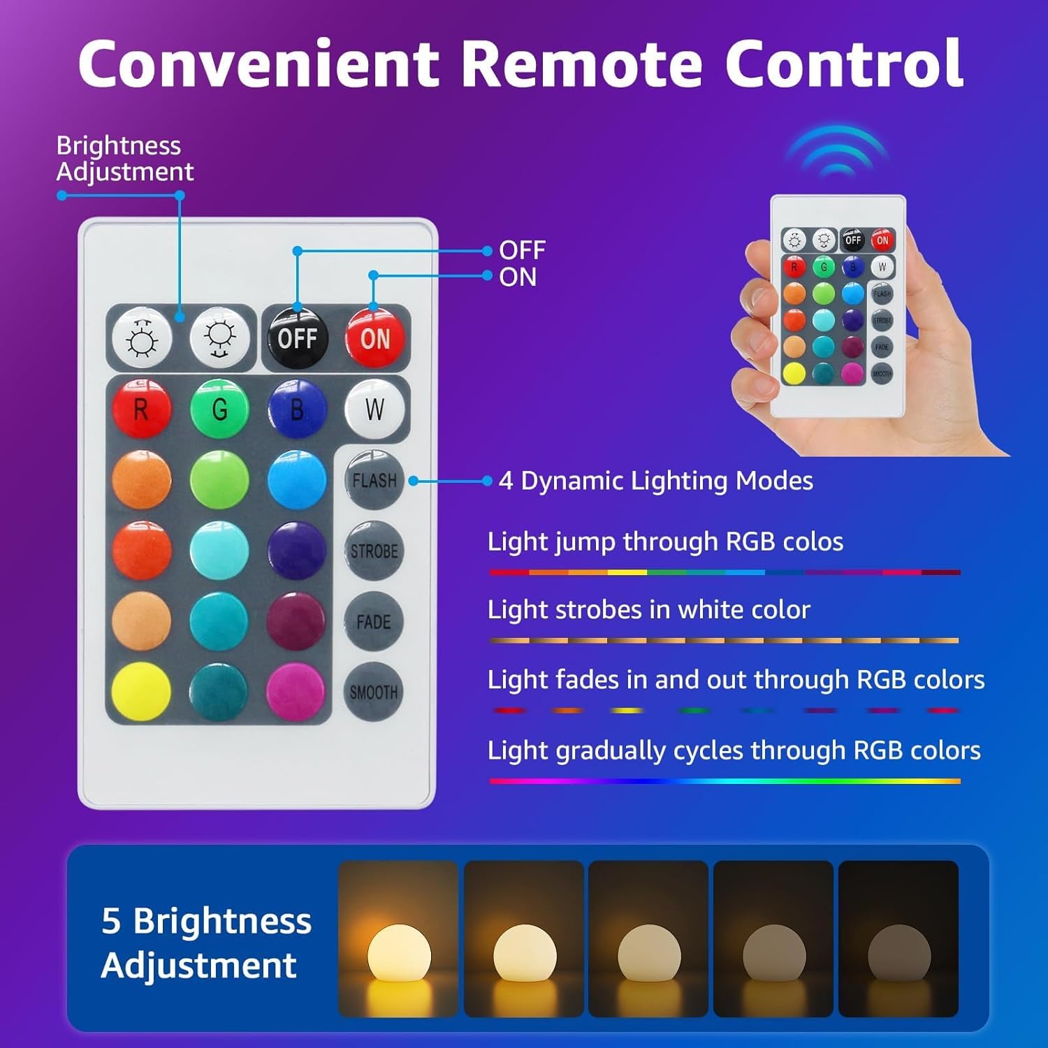 COOL RGB LIGHT & DIMMABLE:The RGB ball night light has 16 RGB colors and 4 dynamic lighting modes (FADE, SMOOTH, FLASH, STROBE), and the brightness of the light can be adjusted from 0% to 100%. Wireless and portable design, you can control it through the remote control or by pressing the button at the bottom of the cube, which is very convenient