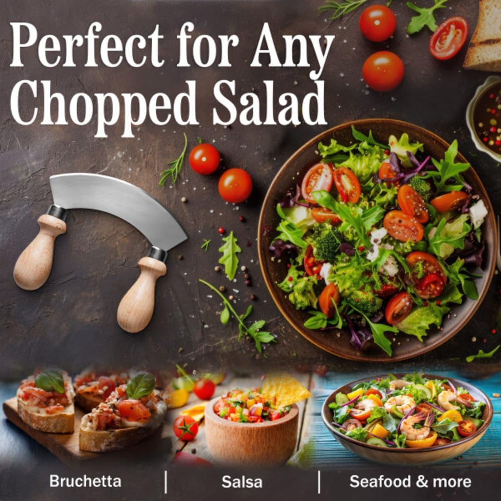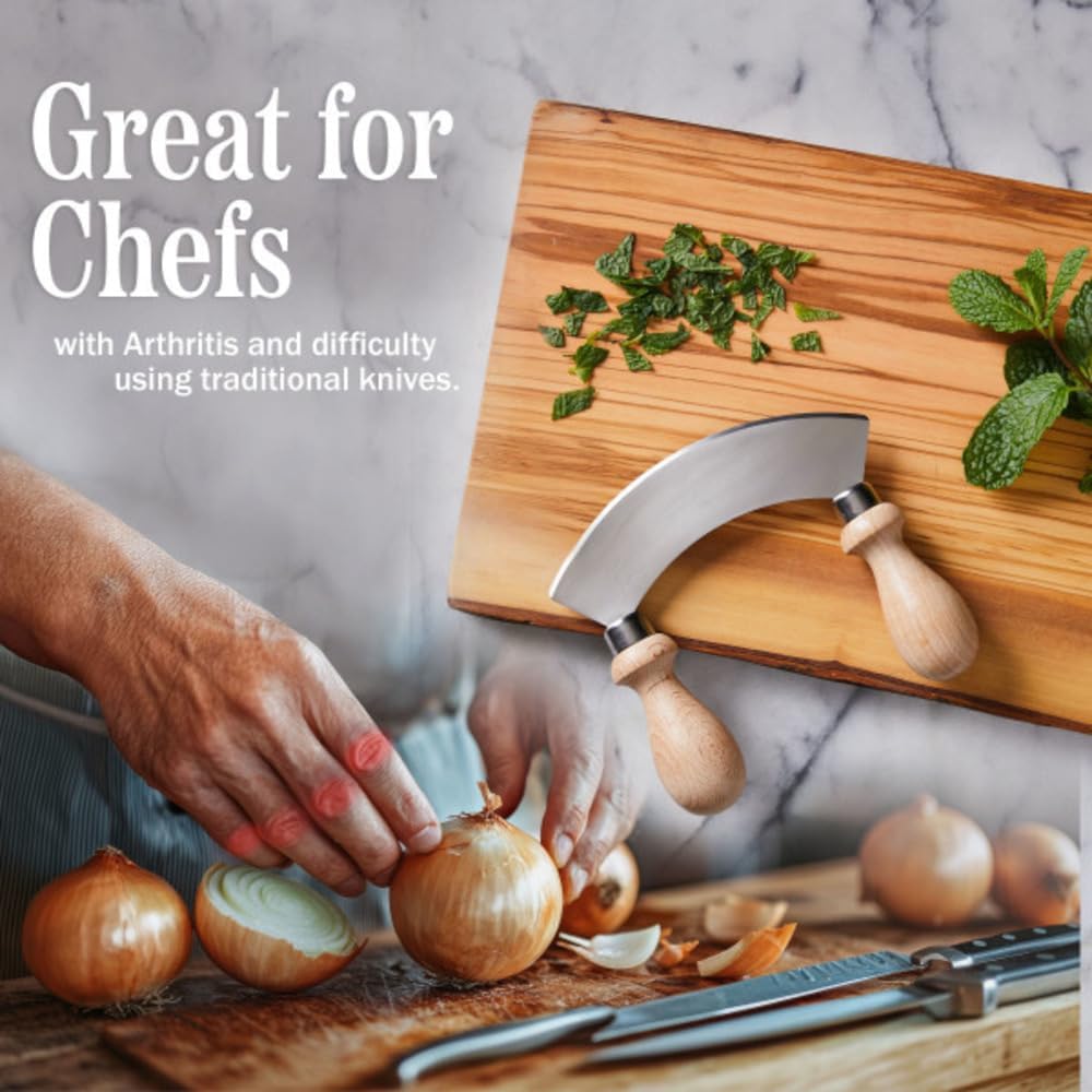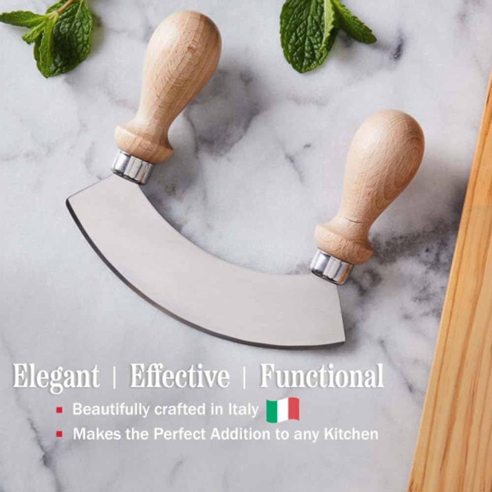 UNIQUE MEZZALUNA CUTTER – This small kitchen knife has a unique crescent-shaped blade that utilizes more downward force compared to a standard chef’s knife, and the rocking action produces clean, precise cuts without the need to drag or pull the blade.