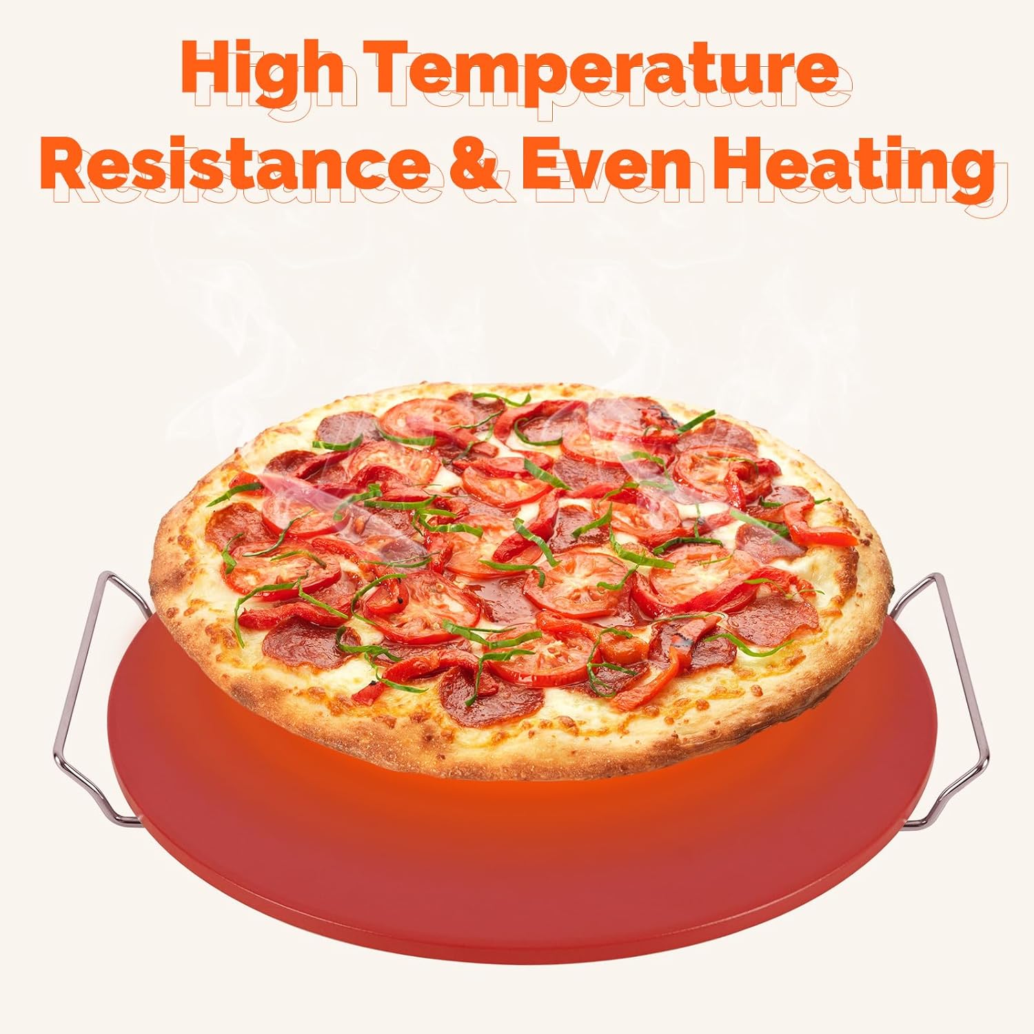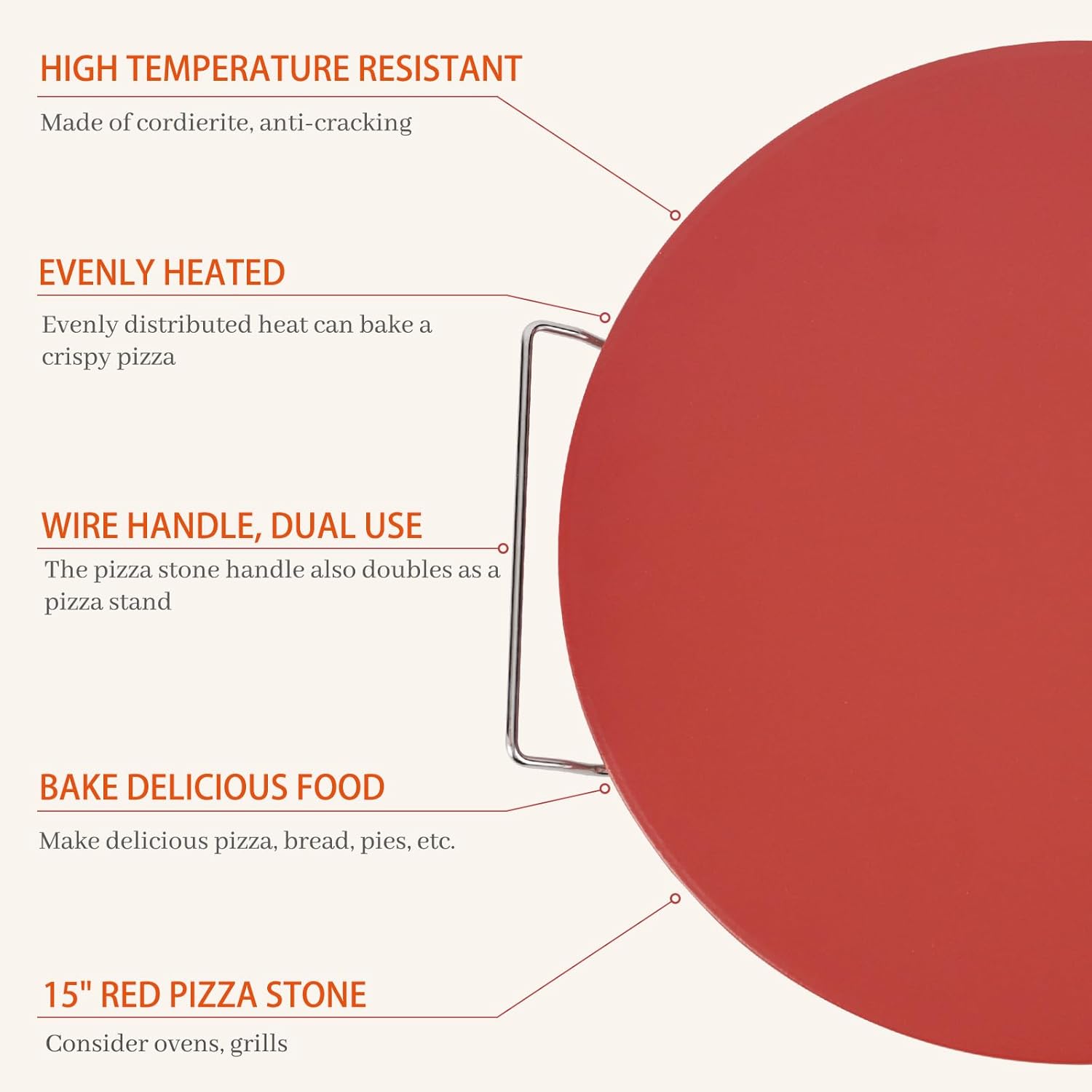 Red Cordierite Pizza Stone: Made of natural cordierite, it is resistant to high temperatures and has even heat distribution. It can make crispy pizza or bread, a must-have for family gatherings, and the best gift for kitchen enthusiasts.