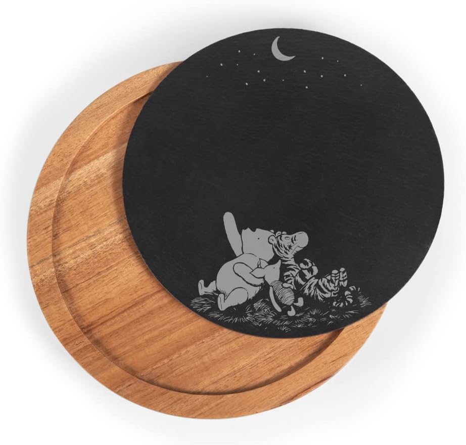 The Winnie the Pooh Insignia Serving Board is a modern complement to any stylish dinner party, with a sweet and dreamy Winnie the Pooh design, included serving tools, and more. This acacia wood and slate cheese board set includes three hidden pro-quality cheese tools, revealed by opening a hidden notch in the side of the serving board. Winnie the Pooh, included charcuterie tools, removable slate serving board, and gold-hued handles? Your dinner party just got upgraded to 100-Acre-Wood status!
