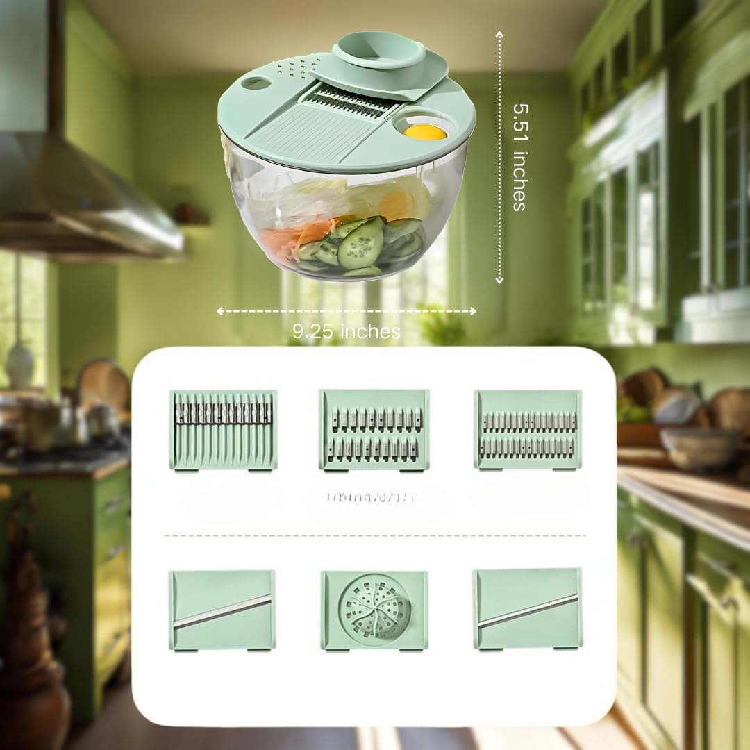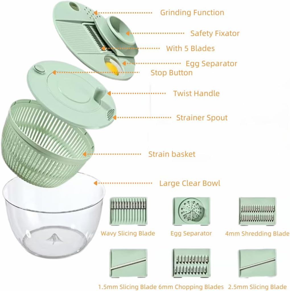 5 interchangeable slicing blades included for endless possibilities! The versatile salad bowl makes meal prep effortless—wash, mix, and spin-dry ingredients and fruits in seconds. Perfect for fresh salads, quick cleanups, and family-friendly cooking!