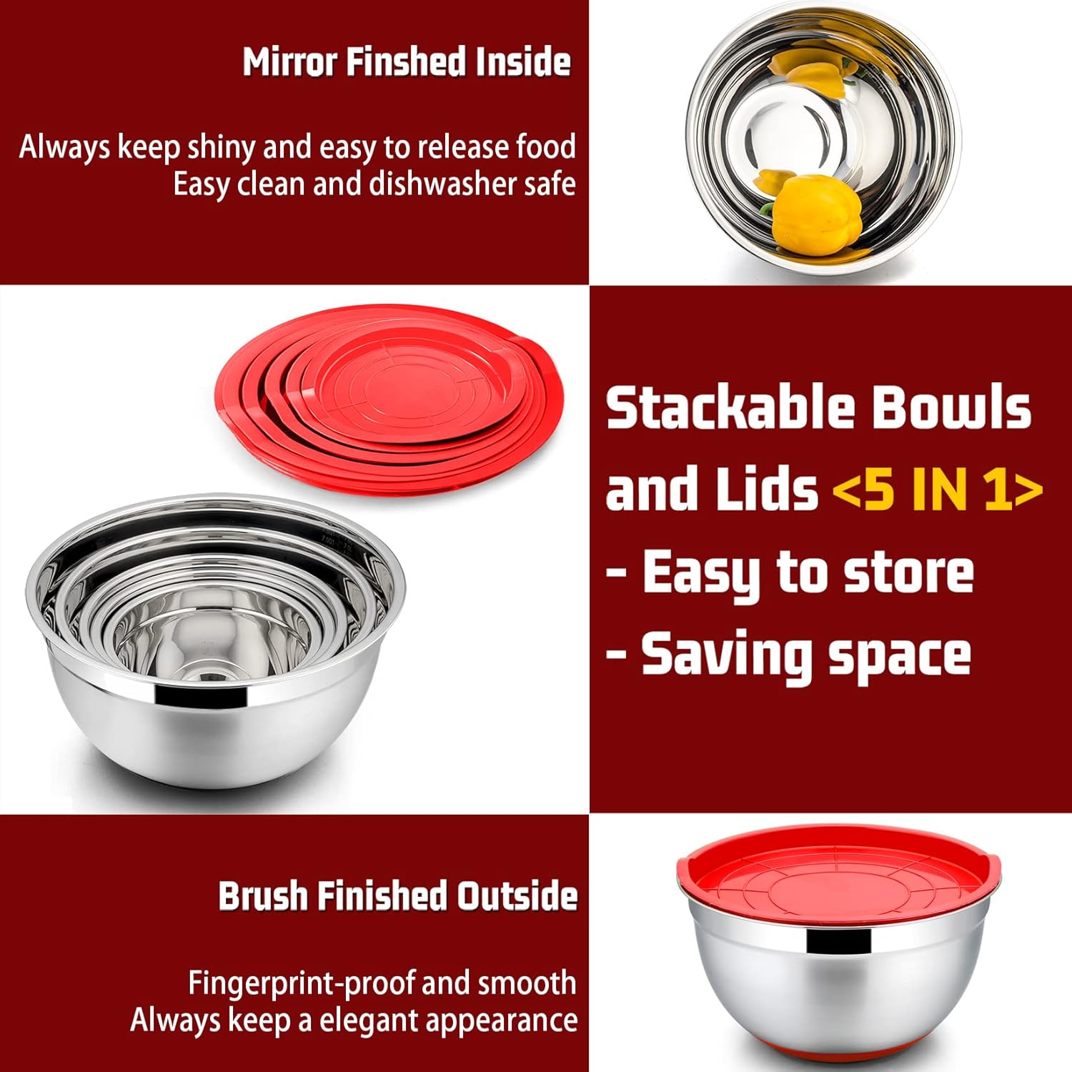 How about P&P CHEF Stainless Steel Mixing Bowls Set of 5? Please focus on the details of these mixing bowls, they would meet your full needs in the kitchen. This kitchen aid stacking bowl set could be a great housewarming gift!
