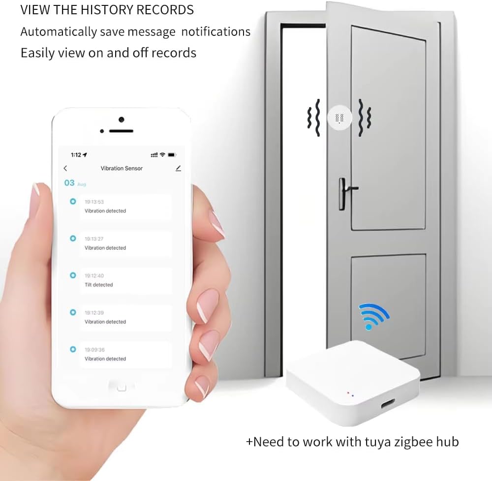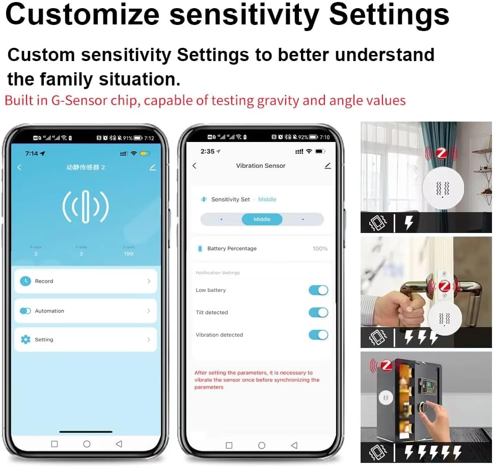 Multiple uses: Vibration sensors are flexible to meet various needs and scenarios in your home, such as garage doors, jewelry drawers, windows, delivery boxes, etc. Versatile solutions for home security and automation.
