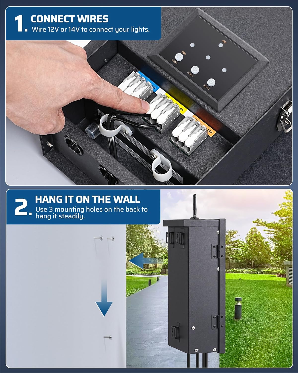 [Three Independent Control Zones] The smart low voltage landscape transformer is designed with three independent zones, simply press the “Zone” button to select 12V/14V AC output; upgraded push-in wire terminals make installation quick, no need for other tools