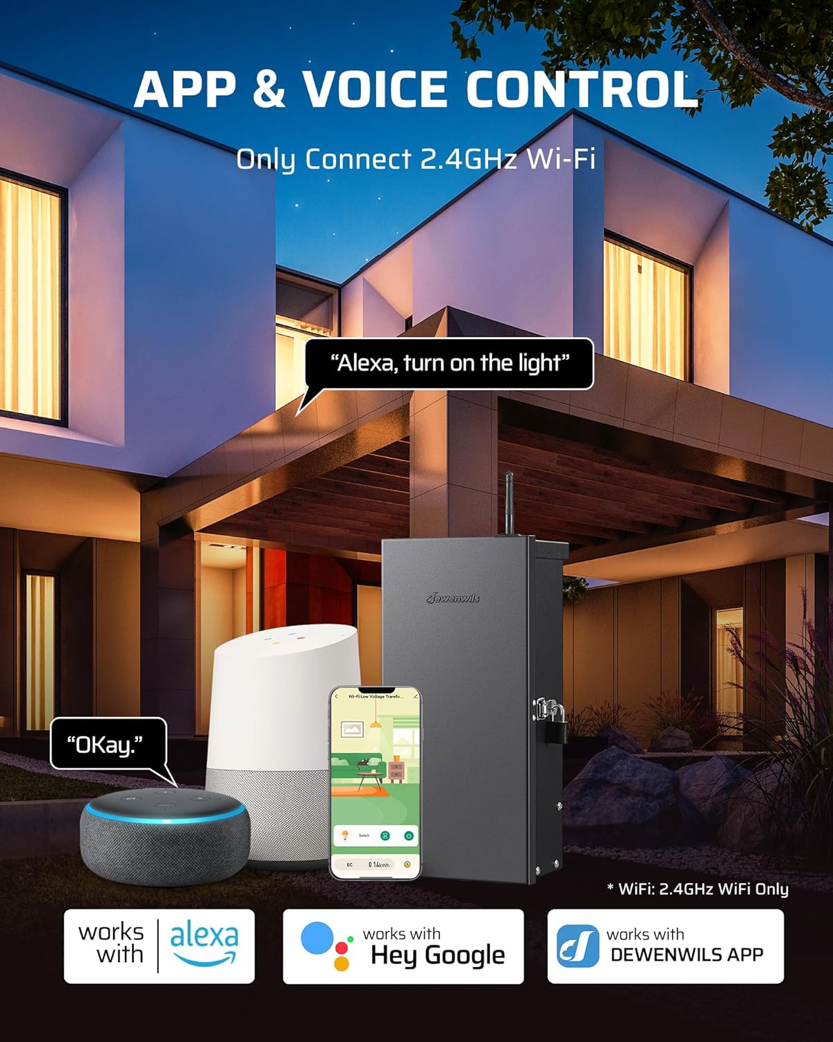 [Wifi & Smart Control] Easily control your lights via WiFi, compatible with Amazon Alexa and Google Assistant for seamless voice control or download “dewenwils” App; No hub is required for setup, and it only supports 2.4GHz WiFi for a smooth and reliable connection