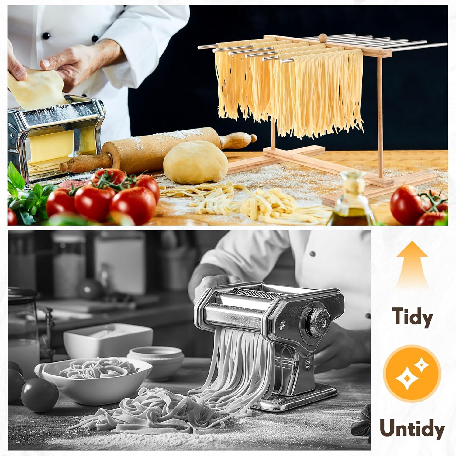 Easy to Assemble: the assembly and disassembly of the pasta drying rack does not require the use of screws or tools, and can be easily adjusted manually; When you are done, just disassemble the parts and store them in the drawer, no tools required