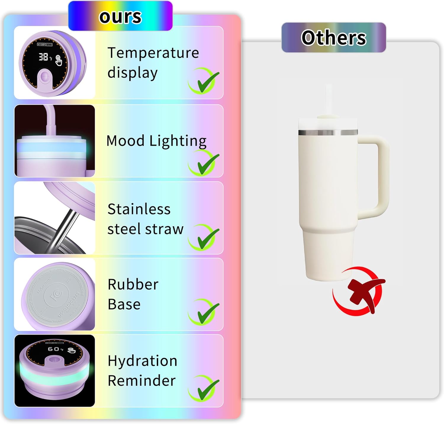 Hydration Reminder Real-Time Temperature Display Mood Lighting Smart Fashion Insulated Stainless Steel 40 oz Tumbler with Lid and Straw(Lavender)