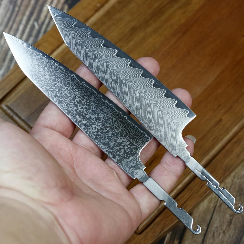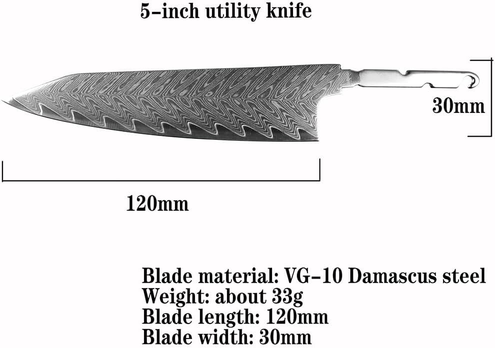 Blade Thickness: 2 mm. Hardness: 60±2HRC. Net Weight: 33g. Blade Material: High Quality 67 ply Damascus Steel, VG10 Core. Finish: Forged Fish Bone Pattern