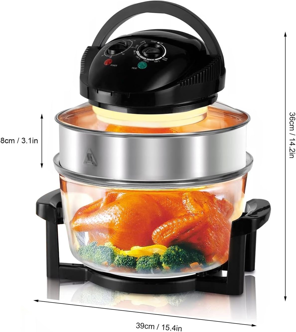 Upgraded 10 in1 Glass Air Fryer Non Toxic Extra Large, Big Boss Air Fryer Glass,Extra Wide Cooking Glass Bowl Removable Heating Oven Top Lid – High-Powered Heating Element Convenient Tabletop Design LED Indicator Lights Automatic Power-Off When Timer Expires Safe for Placement on Any Counter / Tabletop Easy-to-Clean & Heat Resistant Glass Cooking Bowl What’s in the Box:Heating Element Oven Glass Bowl Tabletop Stand Height Extending Insert (2) Tiered Cooking Racks Tongs Technical Specs: Heating Element Power: 1000 Watt Food Capacity: 18+ Quarts Max. Temperature Reached: 480 F Fahrenheit Max. Time Setting: Up to 60 Minutes Power Cable Length: 2.5′ Ft. Power: 120V – Size (L x W x H): 13.4” x 15.8” x 13.8”