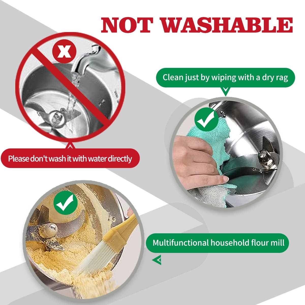 ❗ ❗ ❗ USE TIPS: 1. This electric grinder mill can only be turned on after the lid is fully buckled.2. The materials ready for grinding must be dry enough. 3. Rest the machine for 5-10 minutes after every 3 minutes operation. 4. Do not put the material over 2/3 of grinding bin. 5.Don’t clean the grinding tank with the water directly. Keep water away the grinding tank and use dried rag or brush to clean the machine.