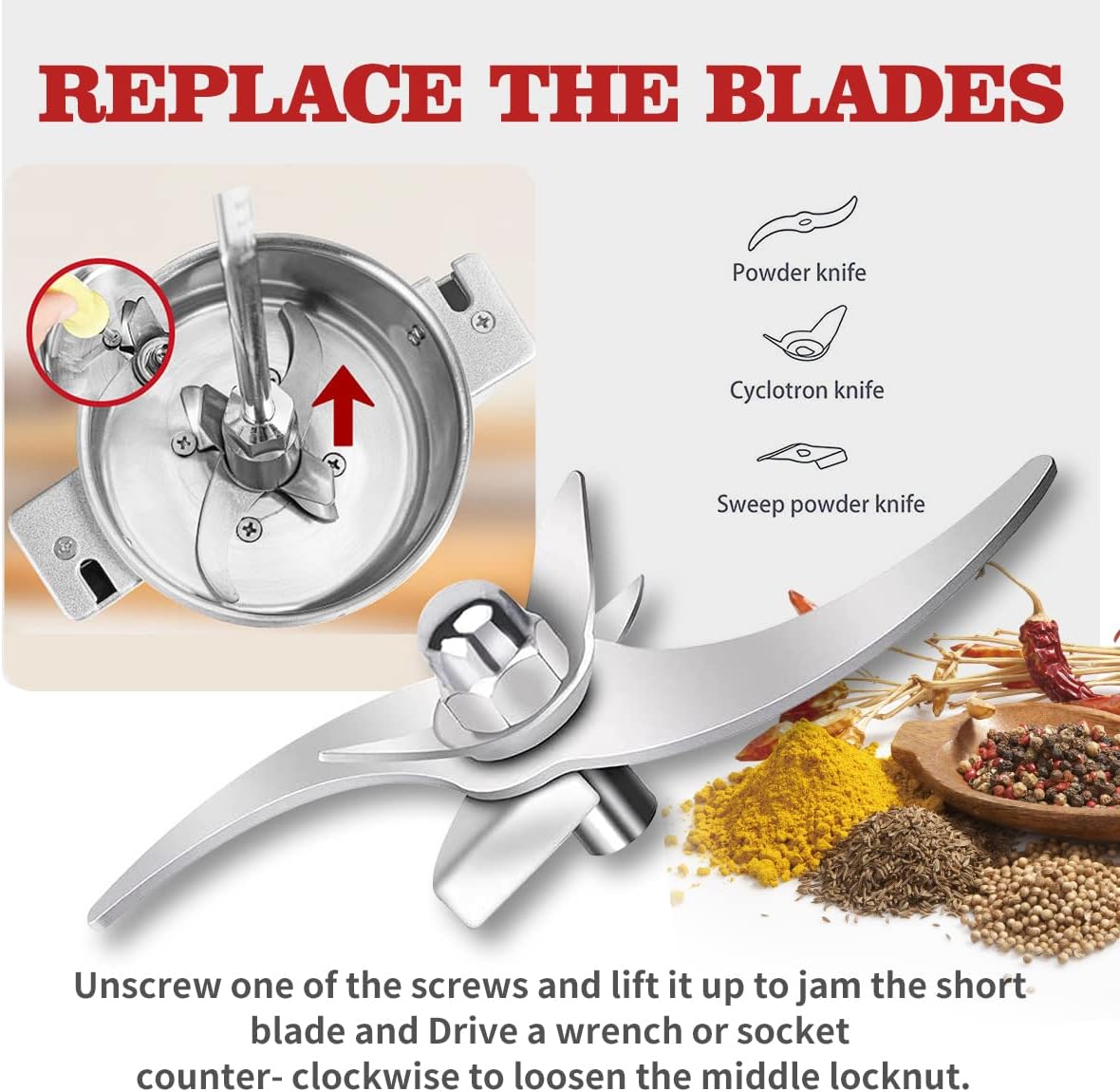 ✅ MIXER GRINDER : Power:2000W ; Capacity:550g; Interval Time:5-10 min;Rotating Speed: 25000R/Min,Triples blade: grinding blade, rotary blade, and powder removal blade, can be pulverized easily. Crushing fineness reaches from 50 to 300 mesh no more than a minute.metal motor blade: wear resistance good.Dry raw materials only.wet, moisture or oil materials can’t be ground