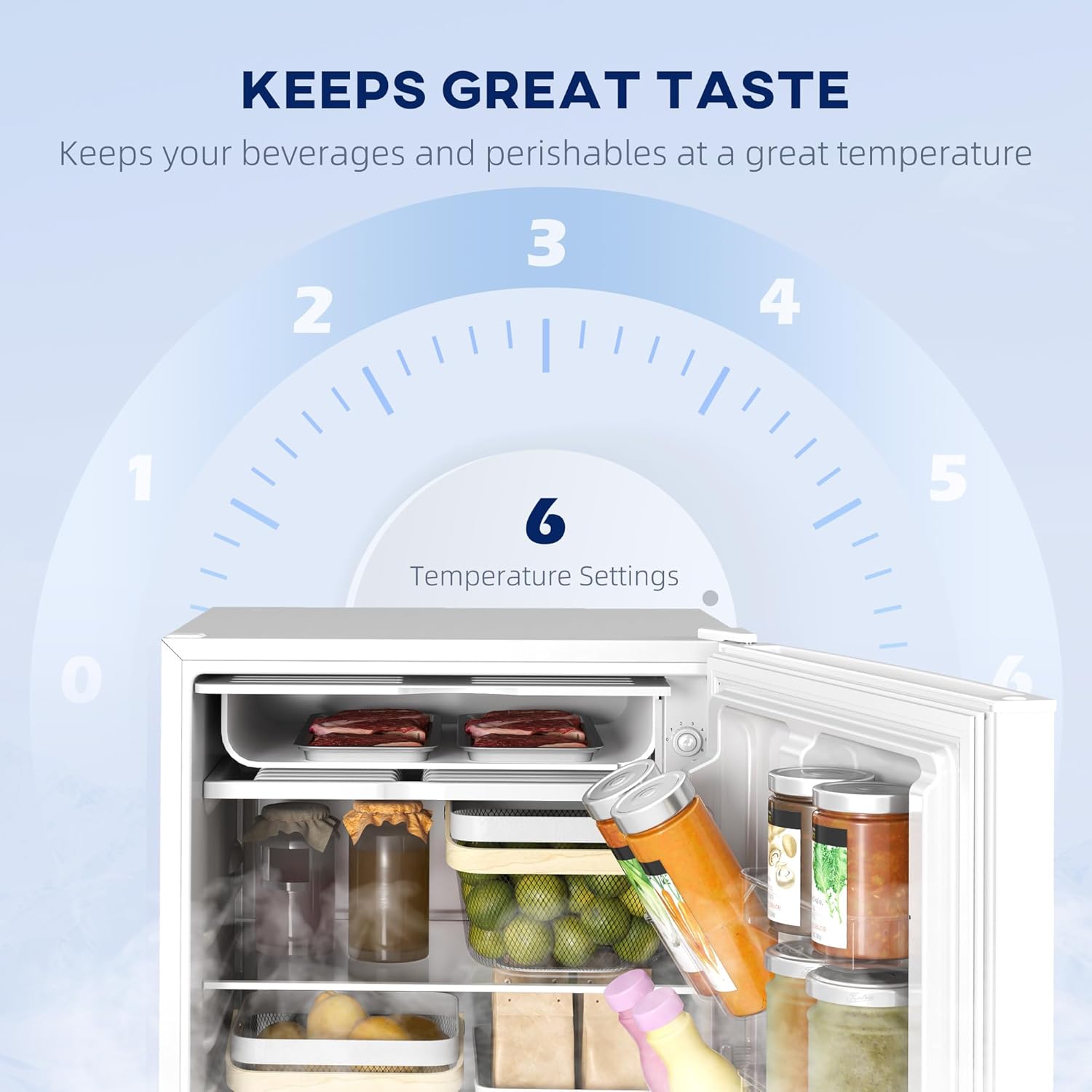 Precise Temperature Control: Equipped with six temperature settings, this mini fridge for office keeps beverages and perishables at a great temperature, ranging from 32 to 48.2°F in the cooler and 15.8 to 32°F in the freezer