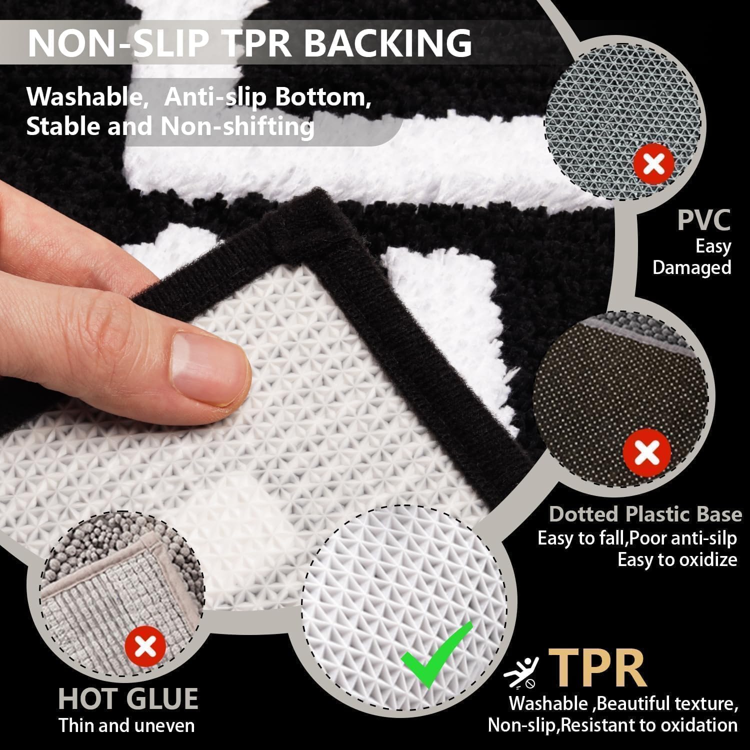 Machine Washable & Non-Shedding:This washable rug are machine washable repeatedly,recommend using cold water and mild detergent, and tumble dry at low speed or hang dry.This funky rug is durable and long-lasting.Every plush is firmly fixed at the backing with an excellent weaving process,don’t worry about the plush of black bathroom rug falling off.Trust KOEXM to provide the highest quality bathroom rugs.