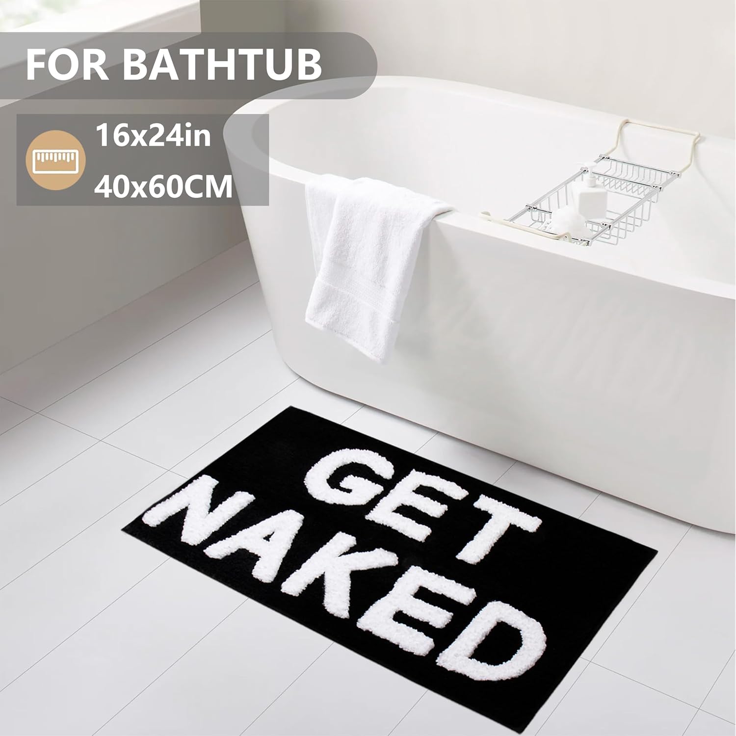 Funny Rugs Design & 3D Effect:This 16″ x 24″ black bath mats shower rug has white letters”Get Naked”.Black bathroom rug,plush letters,unique flocking process,highlighting the visual effect of “Get Naked”.The black and white rug elevate the look of your bathroom decor ! Add a little humor to your everyday bath routine with get naked bath mat.Choose this cute bath mat as bathroom decor,Small bath mat will make your bathing more fun.