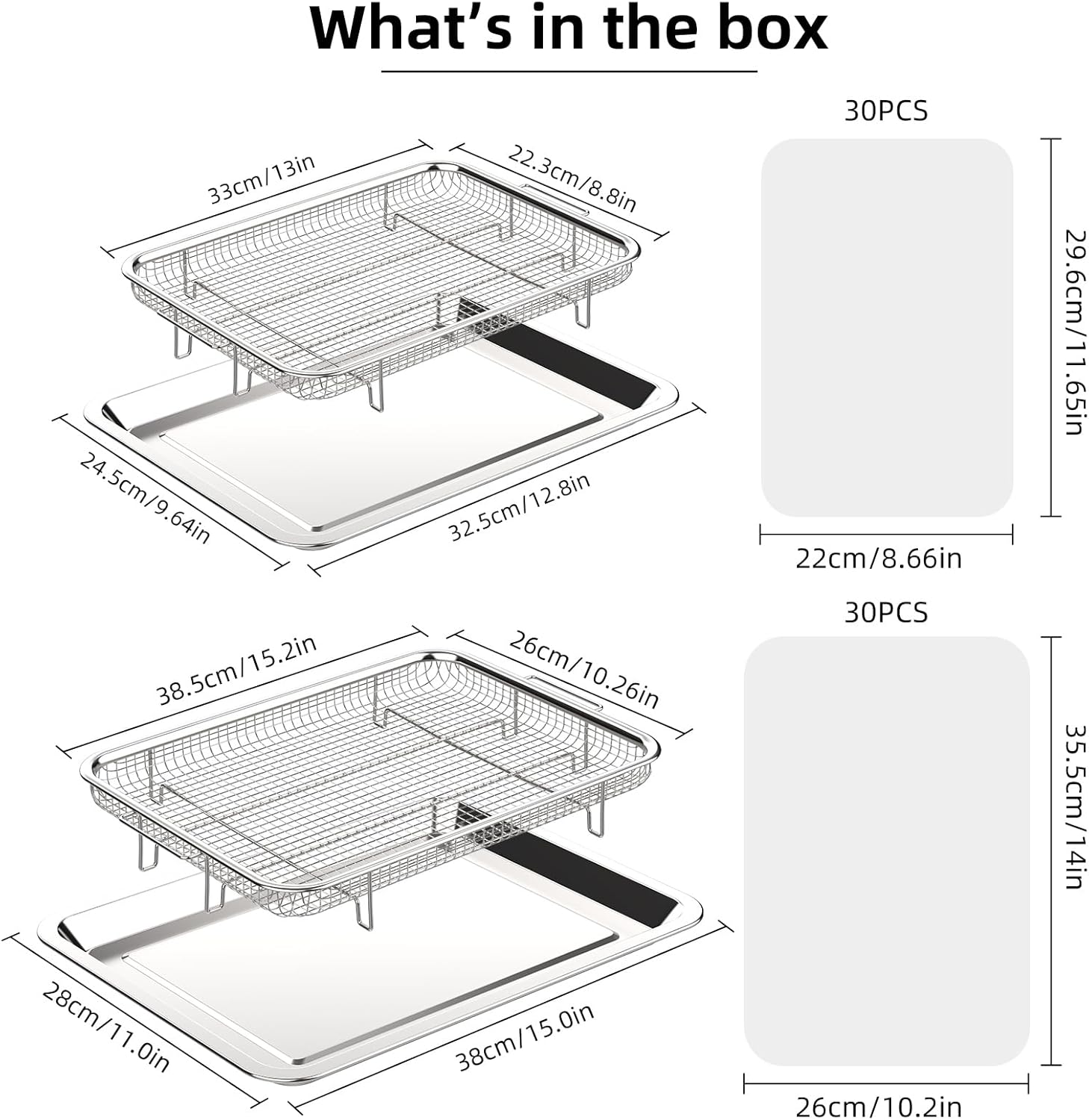 【Great Value with 60 PCS Parchment Paper】- Stainless steel Large and Medium Size air fryer basket comes with 60pcs (medium size 30 Pcs and large size 30 Pcs)non-stick parchment paper, no need to trim and sit perfect in the pan, can prevent sticking while air frying chicken or meats.