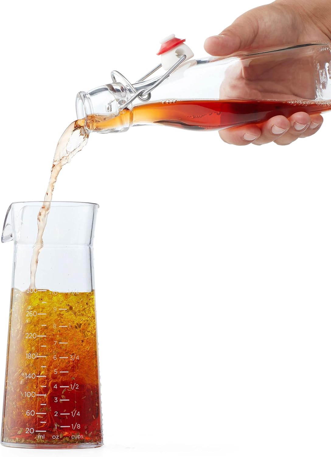 MEASUREMENT GUIDE: Measurement markers including ml, oz, and cups, are conveniently printed on the side of the salad dressing mixer bottle.